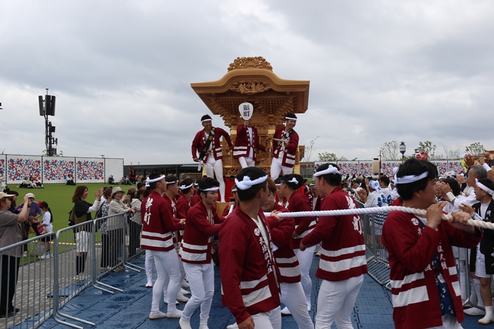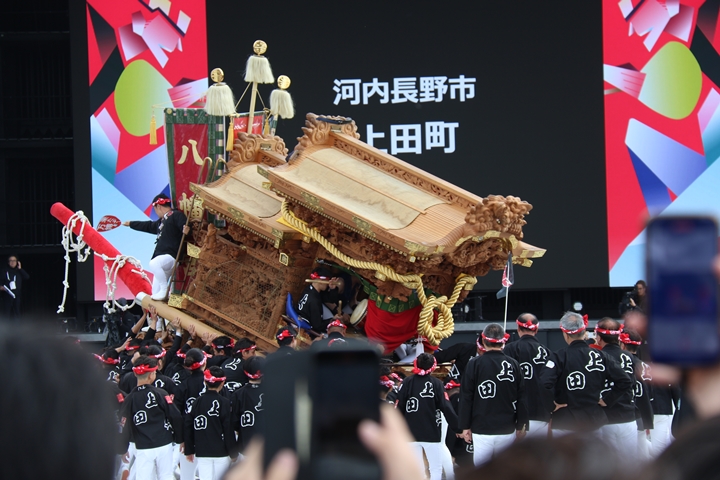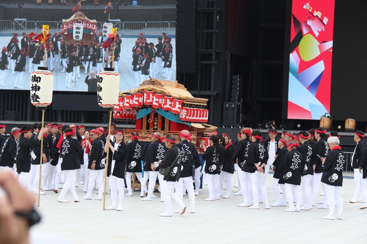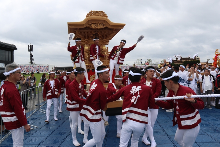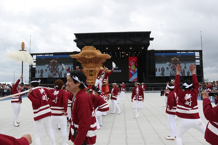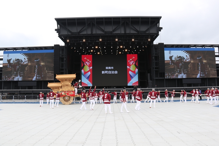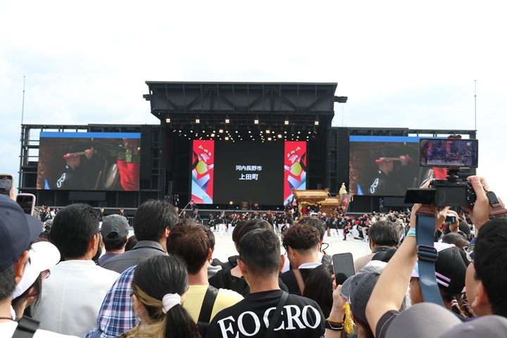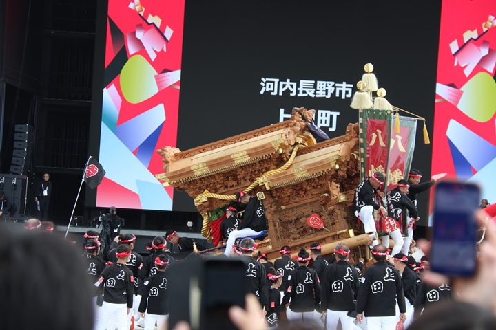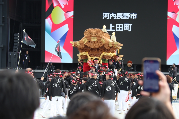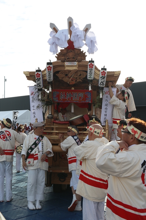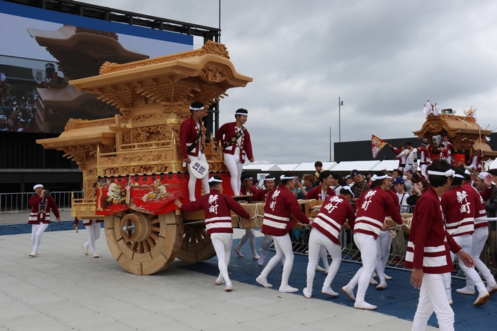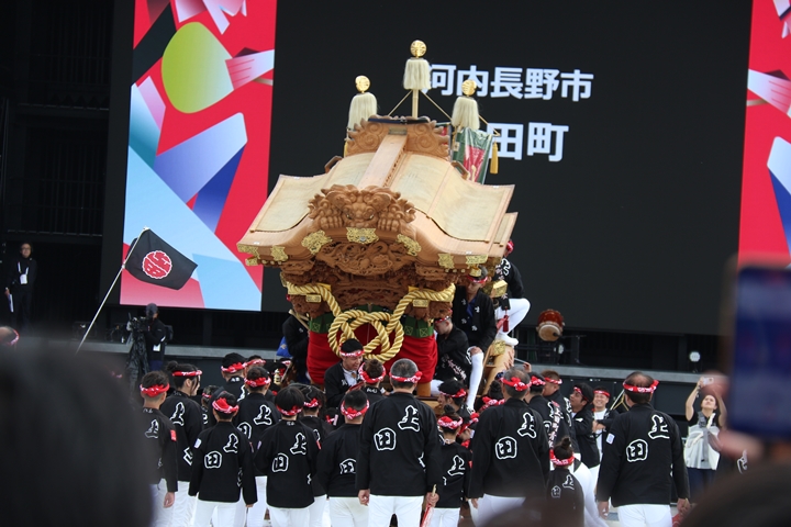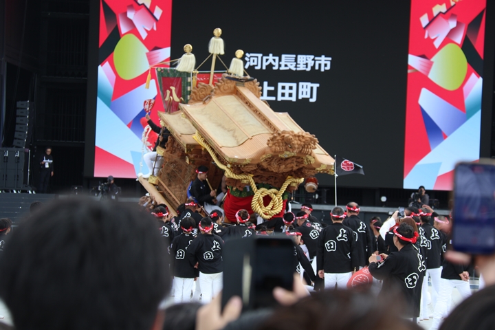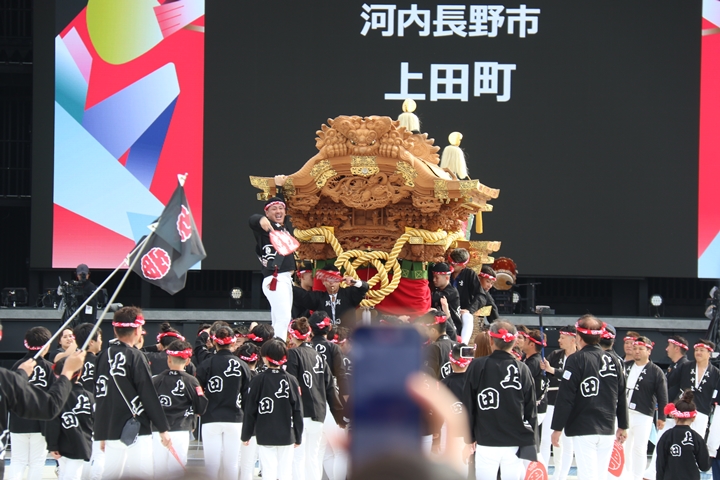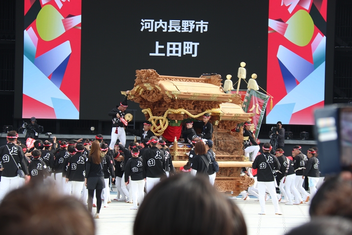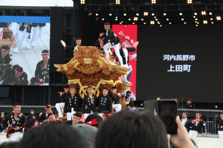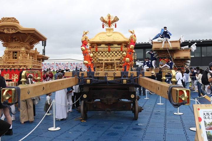 ![]() 実演エリアでは大阪市住之江区・住吉区 高崎神社布団太鼓保存会の布団太鼓。 |