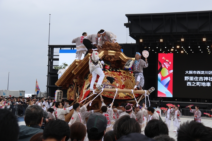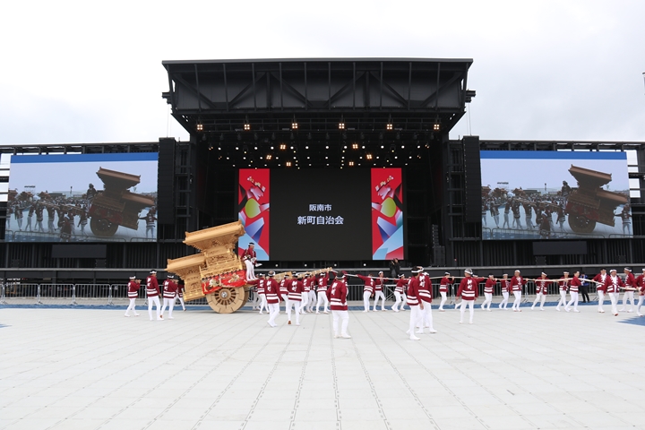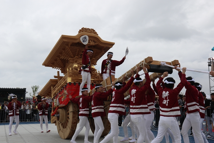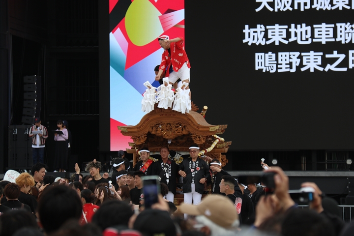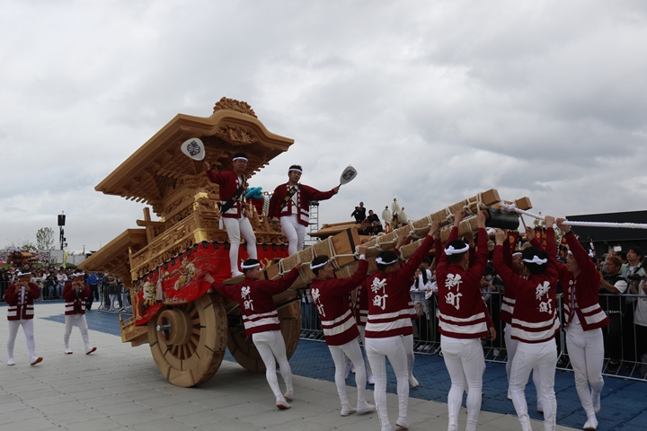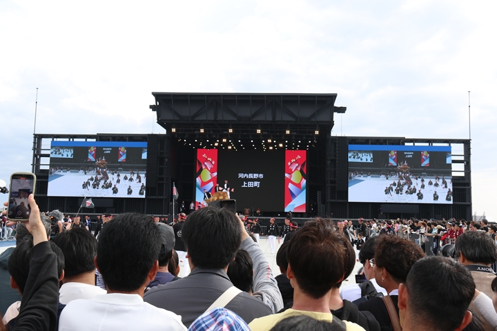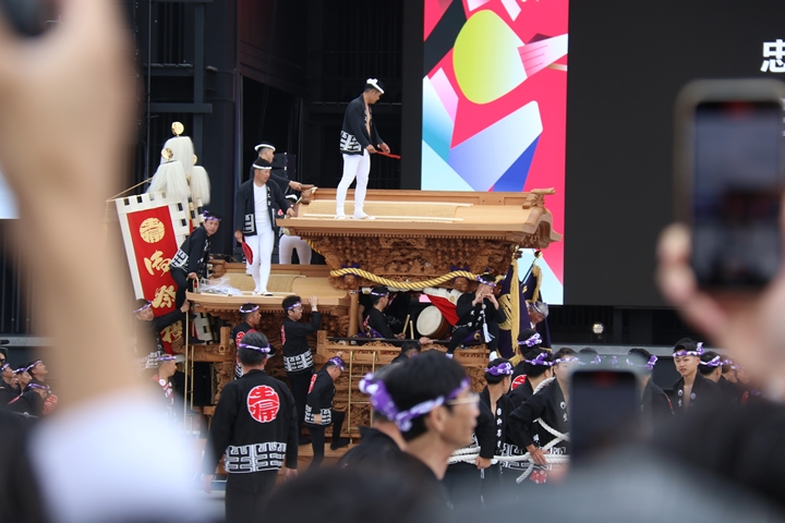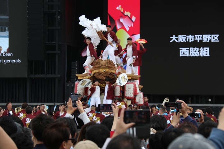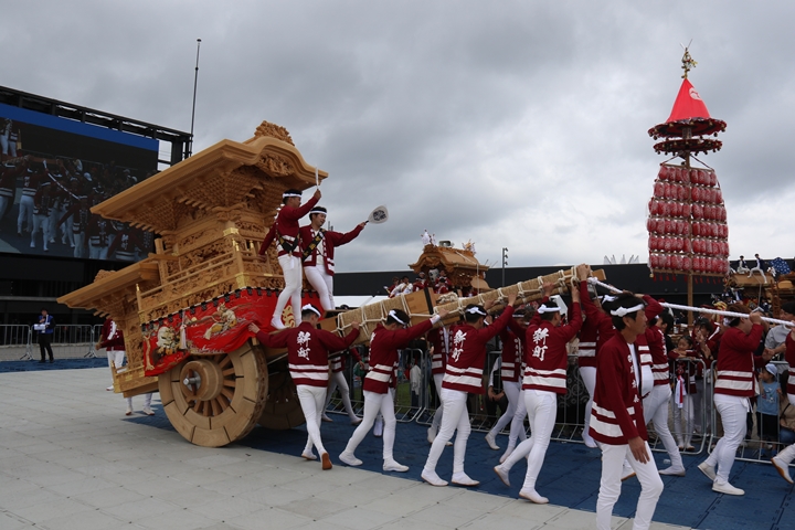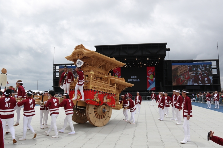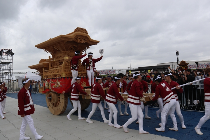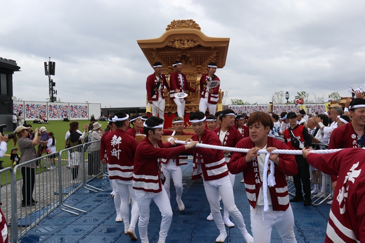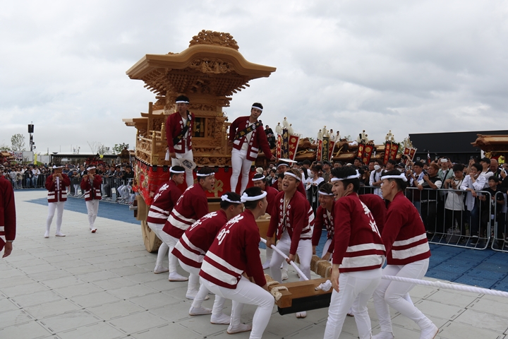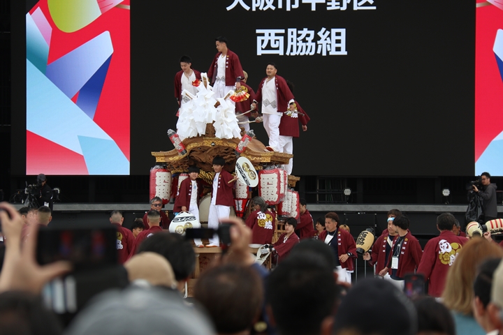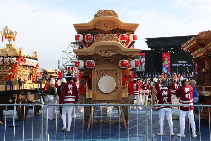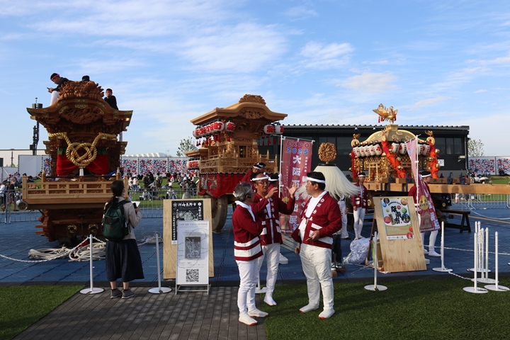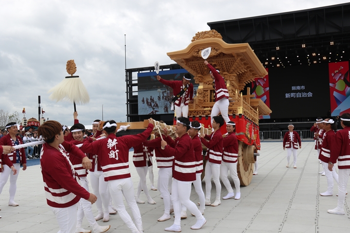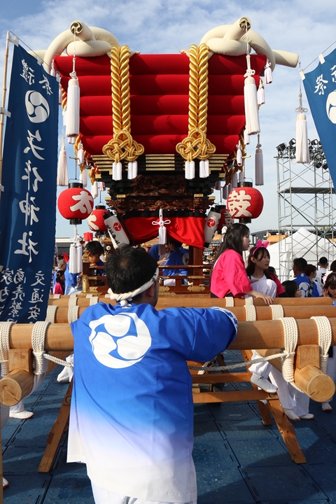 ![]() 実演エリアでは大阪市住之江区・住吉区 高崎神社布団太鼓保存会の布団太鼓。 |