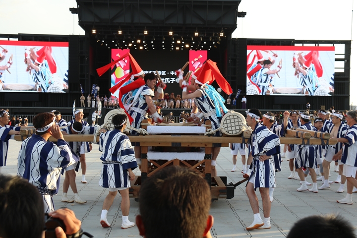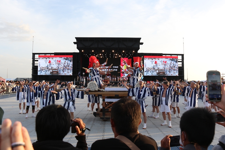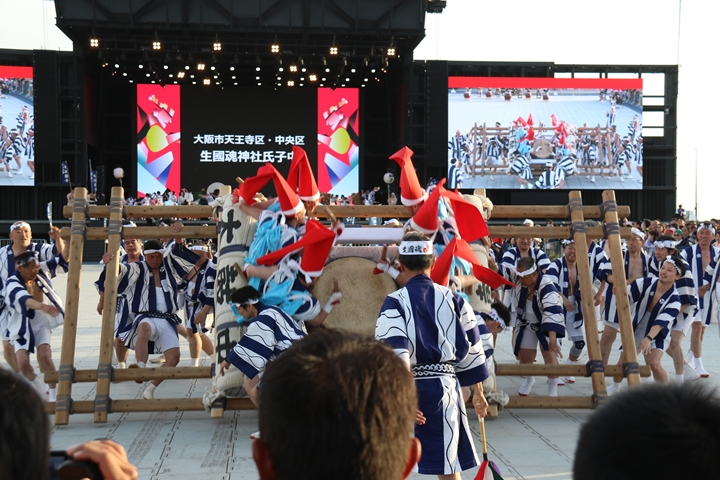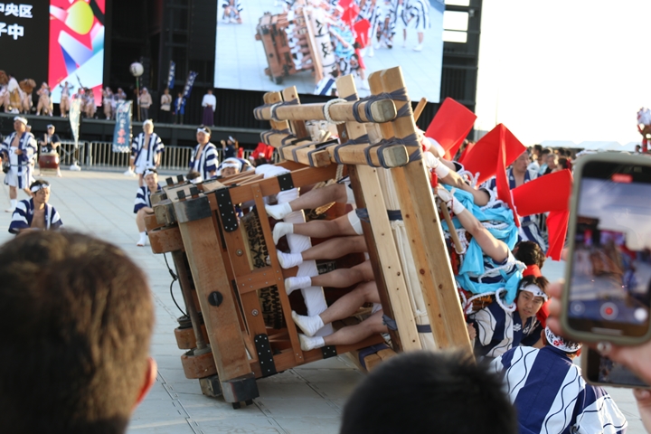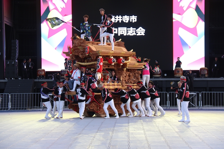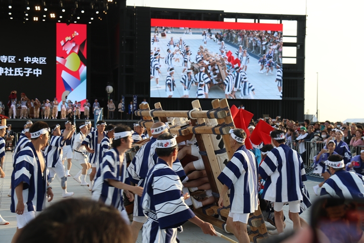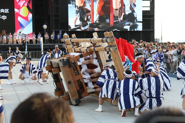 ![]() この日3回目の実演タイム、 まずは堺市新在家濱太鼓台保存会のふとん太鼓。 |