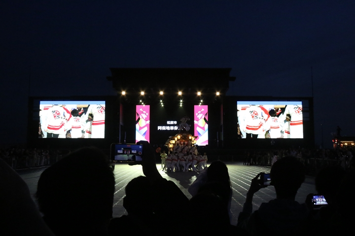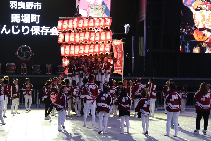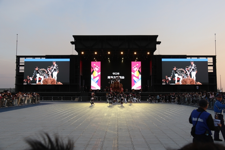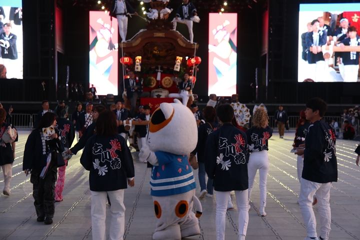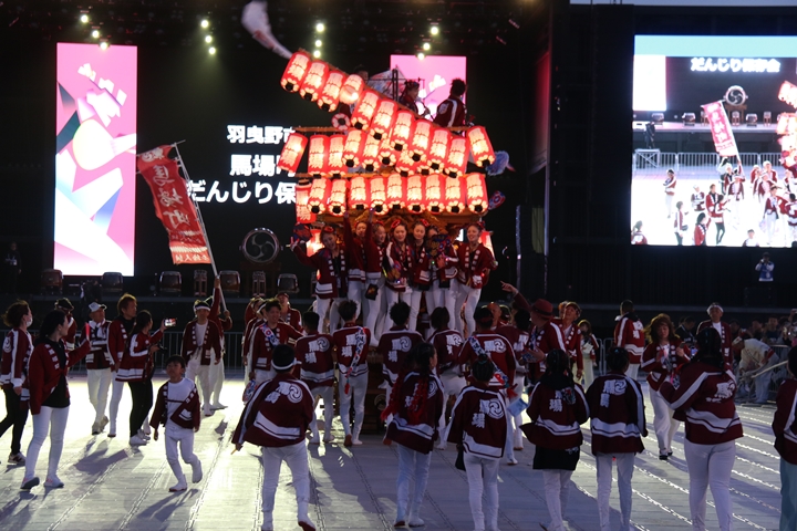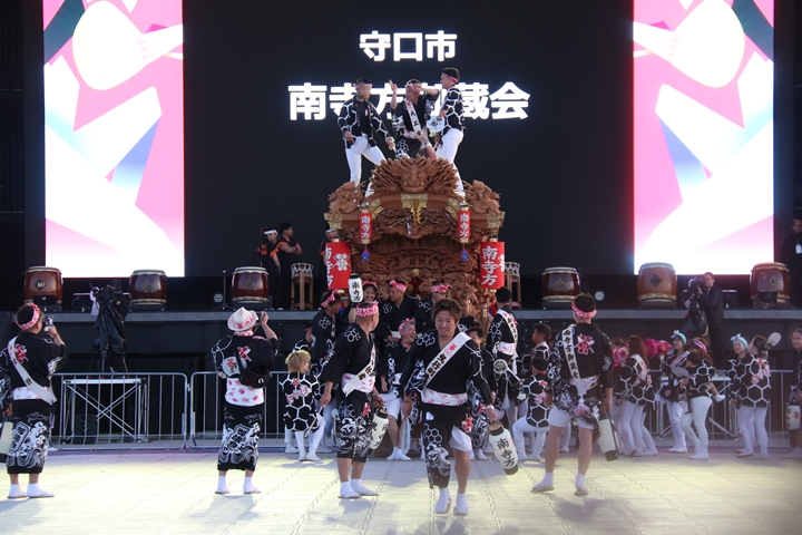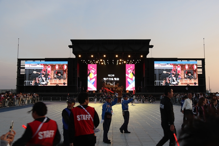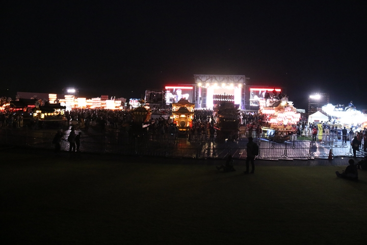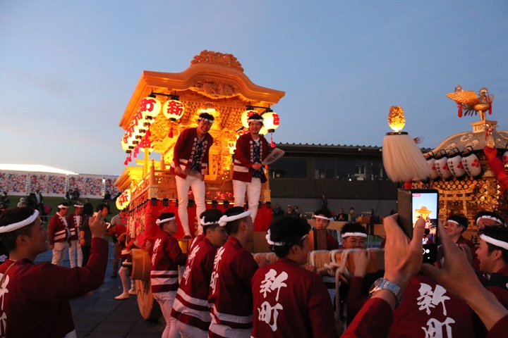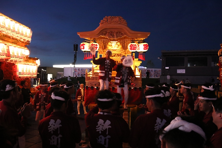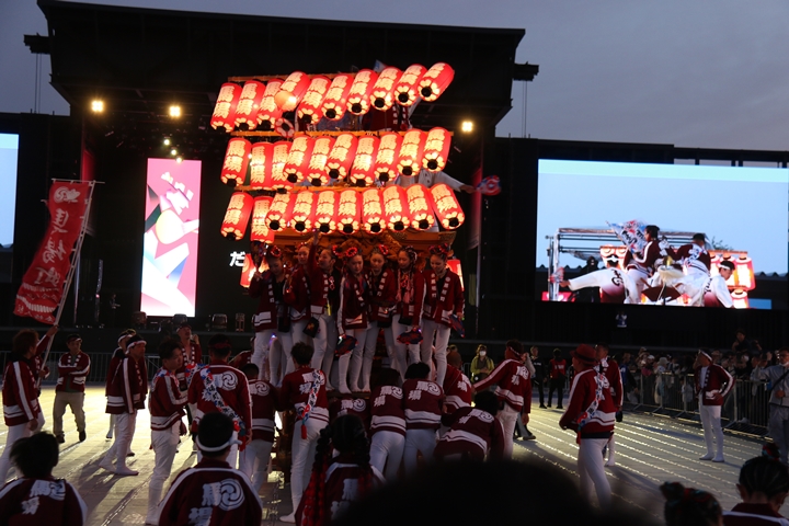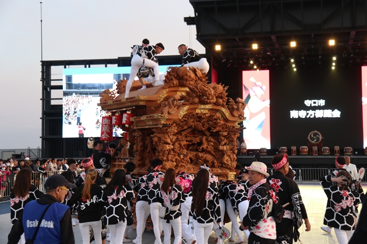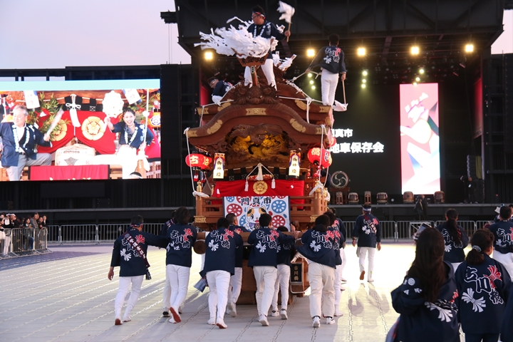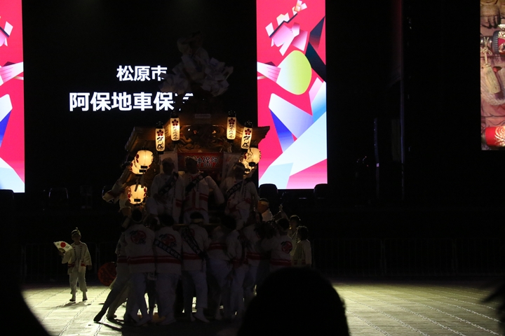 ![]() すると突然ステージのモニターに新町の映像が放映。 実は実演の時に放映されませんでした。 ちなみに真ん中で見えるのは大東市西諸福地車保存会のだんじり。 |