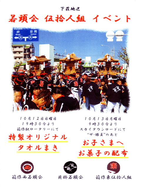 2014/8/30 - 第6回自町若頭会寄合![]() ◎ 管理人のだんどり日記 #.35(8月30日土曜日・ )今日は朝から南海バス(南海ウイングバス南部 本社営業所・泉佐野市日根野5619-2)に祭禮当日、箱作駅ロータリー使用に関してのお願いに。南海バスを終えて諸用で大阪市内に出かけ少し昼寝をしてから19時30分に住民センターへ向かいました。 … ◎ 第6回自町若頭会寄合 ・8月30日土曜日20時から、自町住民センターにて ・内容:本年度の祭禮に関して etc. … 今日は20時より住民センターにて第5回祭礼四団体による寄合が行われました。去る24日(日)に行われた下荘地区寄合の報告、曳行予定の説明、そして私から若頭会○○○の説明をさせて頂き約25分で終了。次いで第6回若頭会寄合を行いました。今回は議題等は特になく、詰所の開催予定日等の報告をさせて頂き約10分程度で終了。それからいつもならメリケン屋へ行くのですがメリケン屋が珈琲店に変わるらしく現在店舗改装中、かんてき屋も満席でやむを得ず体育館裏へ行くがどこも満席。色々店を探してて焼き鳥かじ平が開いてたので焼き鳥かじ平へ。結局23時過ぎまで楽しい時間を過ごさせて頂きました。 でも自町から体育館裏や焼き鳥かじ平って結構遠く、有志ながらも参加人数が少なかったのは否めません。体育館裏や焼き鳥かじ平までの足がなく、車だったら飲酒運転になるのでダメだし…。まぁ〜今回で寄合→飲み会って流れは最後なので良かったですが、よくよく考えれば箱作って居酒屋が少ないなぁって改めて思いました。 で、"先日の書き込み"で若頭会○○○と言葉を濁しましたが、今日若頭会寄合で会員に内容を報告したので当ブログでも御紹介しようと思います。若頭会○○○とは下荘地区の若頭会・伍拾人組合同で祭禮1日目の夜、箱作駅ロータリーにてイベントをする事になりました。イベントと言っても特製オリジナルタオルをまくだけなんですが…。 実は6月7日(土)の下荘地区若頭会親睦会にて箱作西若頭会会長さんより「イベントをしよう!」との御提案があり、6月21日(土)の自町若頭会寄合にて提案しましたが却下。7月12日(土)の下荘地区若頭会寄合にて再度、箱作西若頭会会長さんより「イベントをしよう!」との話があり7月26日(土)の自町若頭会寄合にて再提案し、やっと了承して頂きました。内容に関しては当初、餅まきでしたが諸事情により特製オリジナルタオルをまく事に。箱作西若頭会会長さんの仕事柄、タオルのデザインや発注等をお願いし私はイベント実施要綱やタイムスケジュール、そしてイベントPRのためのチラシの作成等を担い今月24日(日)の下荘地区寄合にてイベント案を提案、快諾を頂き今日、自町祭礼四団体寄合並びに自町若頭会寄合にて報告させて頂きました。 タオルのデザイン等は祭禮終了後に御紹介させて頂きます。中々エエデザインと言うか今までにないデザイン、下荘地区若頭会・伍拾人組の結束力が盛り込まれたデザインかと思います。10月12日(日)19時30分頃より保存会・若頭会タイムの流れの後、イベントをしようと予定してますので楽しみにしてて下さい。 |