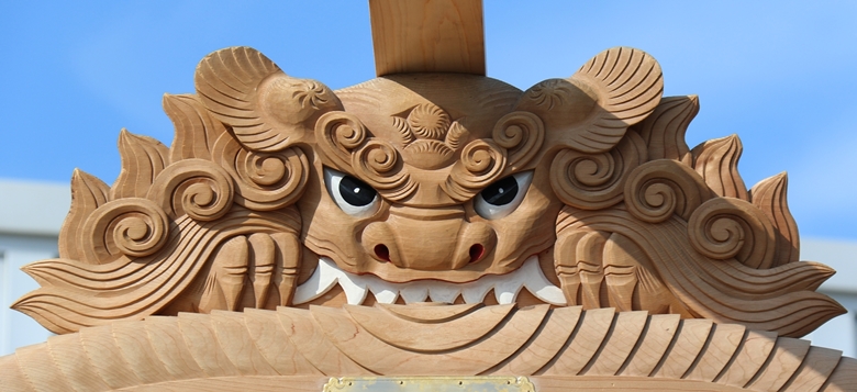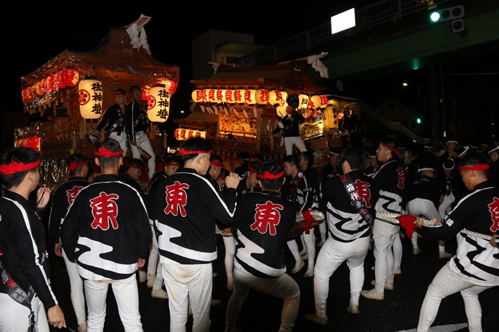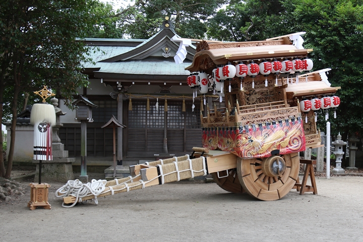 | 下荘地区には貝掛には指出森神社、箱作西には加茂神社、箱作東には菅原神社が鎮座しており3台のやぐらが揃って各神社へ宮入りします。昔は1日目に菅原神社・加茂神社へ宮入り、2日目に指出森神社へ宮入りしていましたが昭和63年、昭和天皇がご病気で自粛ムードの中、この年やぐらを新調した箱作西の加茂神社へのみ宮入りを行いました。 以降、いわゆる「宮当番」制度が始まり2日目の夕方、加茂神社、菅原神社、指出森神社の順で下荘地区のやぐらが宮入りします。他町の神社へ宮入りする習わしはとても珍しく、下荘地区独自の習わしかと思います。 |