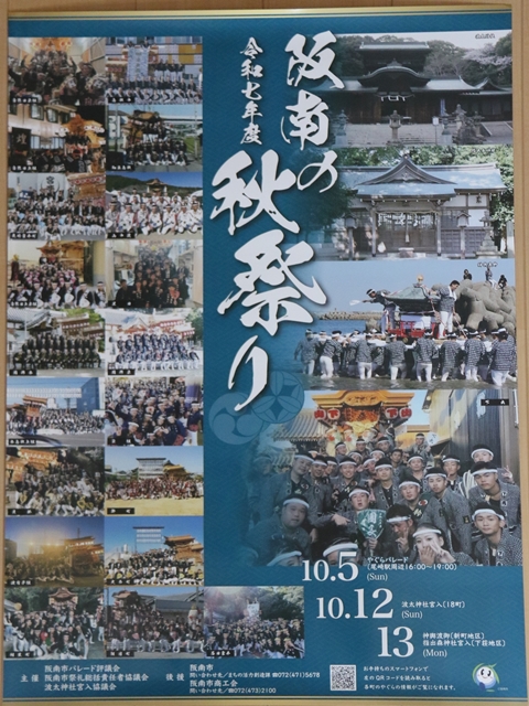 2025/9/3 - 阪南の秋祭りのポスター![]() ◎ 佐野川くんのばんぱく日記 (9月3日水曜日・ せっかく日曜日に設置した家の近所の町の提燈ですが明日接近予定の熱帯低気圧の影響で今晩、撤去作業が行われていました。御苦労様です。さて今日も祭り関係の動きはなく平穏な一日でした。ところで先日、阪南の秋祭りのポスターを入手しました。今年は小生撮影の波太神社・指出森神社の写真も再採用されており嬉しいやら恥ずかしいやら…。ともあれ今年も格好イイポスターに仕上がっています。 |