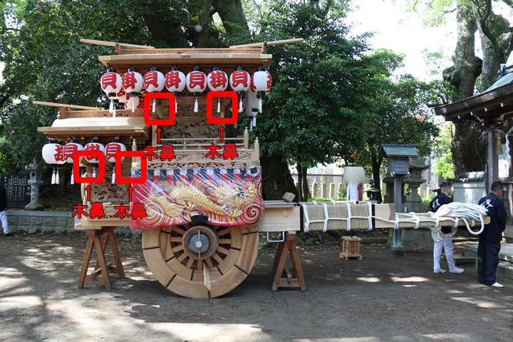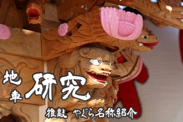 ◆ 地車研究 feat. 推敲 やぐら名称紹介Y![]() 親サイト内「やぐら名称紹介」を最後に編集したのが10年以上前になります。そこで改めて「地車研究」と題して各項目を【推敲】しようと思います。今回は「木鼻(キバナ)」を推敲します。 まず【木鼻】をネットで検索すると「柱を貫通する頭貫・肘木・虹梁・の柱から突き出た部分」とあります。やぐらには下画像の通り大屋根に8ヶ所、小屋根に6ヶ所合計14ヶ所に木鼻があります。 ![]() ![]() ![]() ![]() |