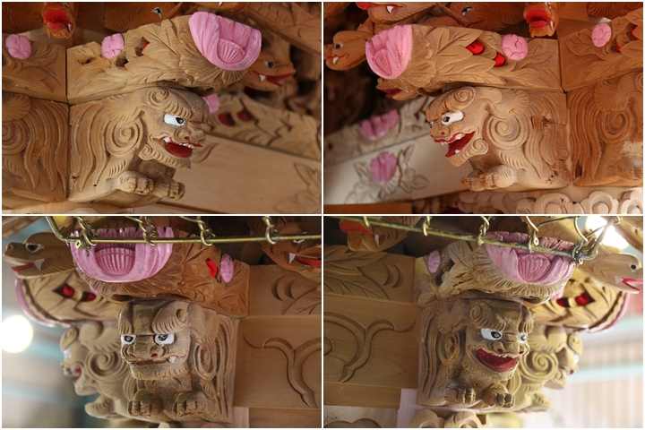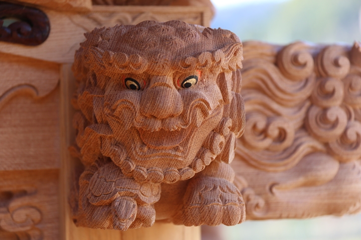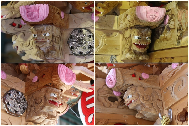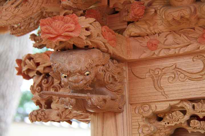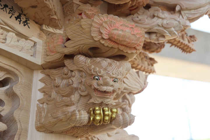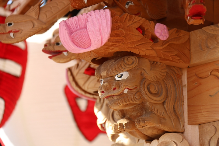 | 中でも大屋根後面の木鼻は小屋根に隠れて見えづらく彫物マニアが撮影する際、難儀する場所の一つです。またかつては阿吽の唐獅子が定番でしたが近年では子や宝物を抱く唐獅子、そして地元にちなんだモノを咥えさせたりと嗜好を凝らせる場所の一つになりつつあります。 |