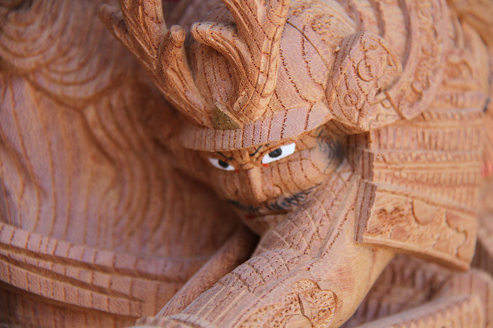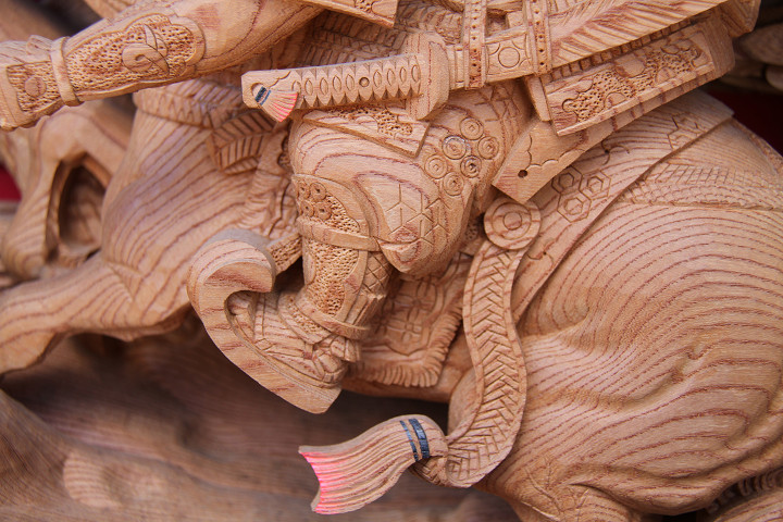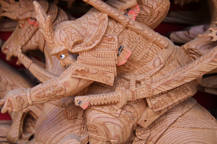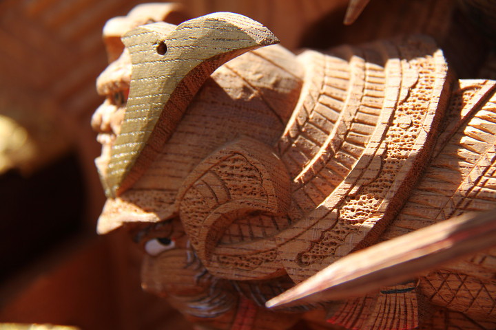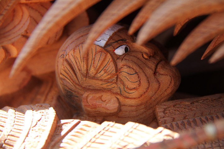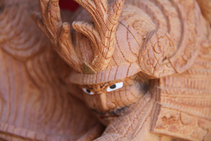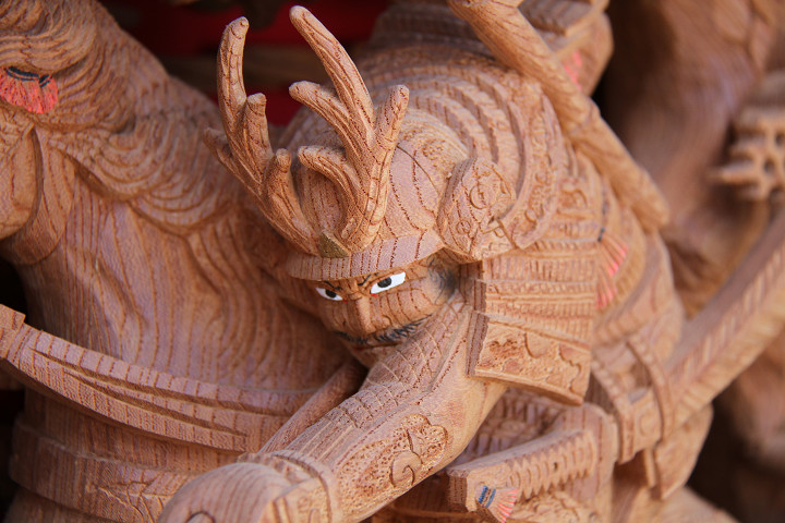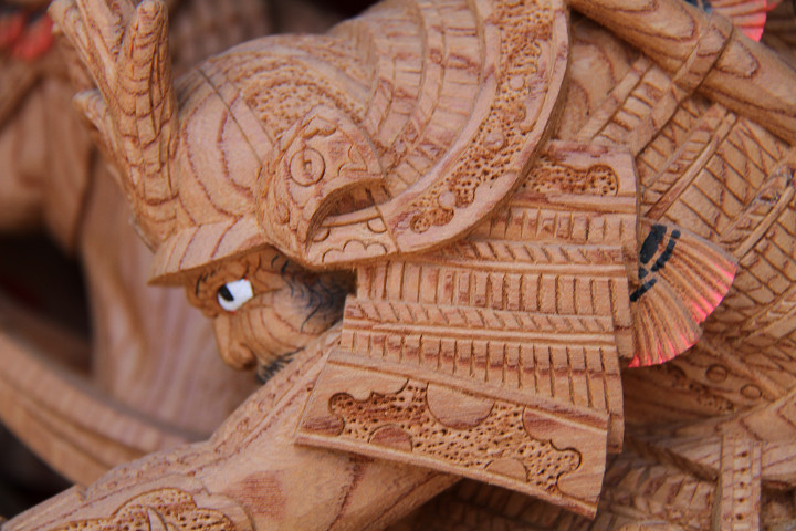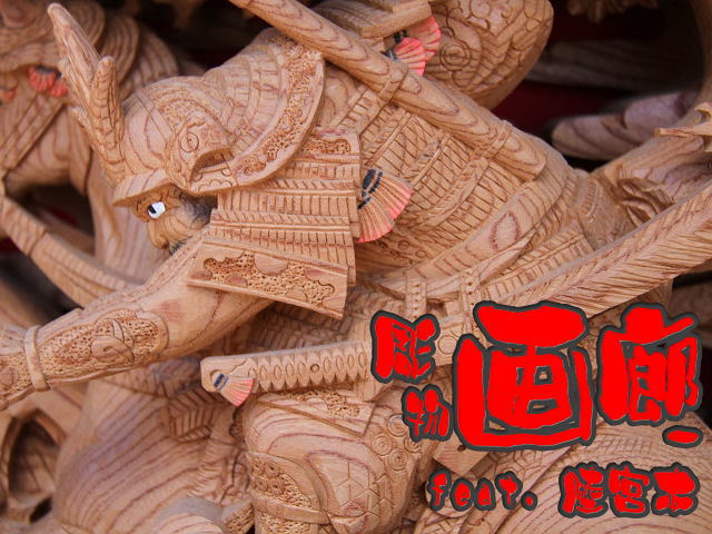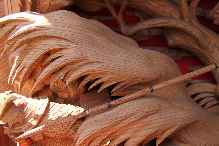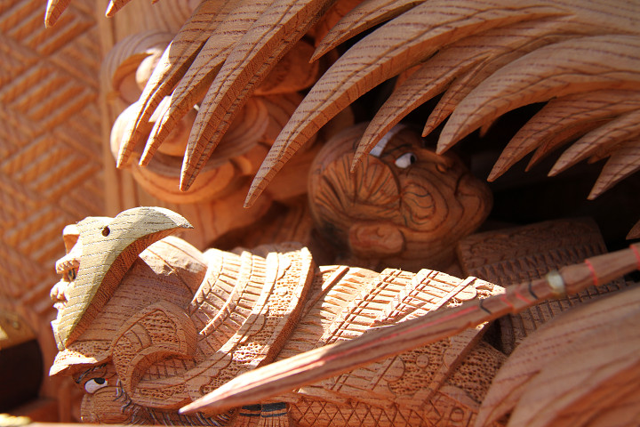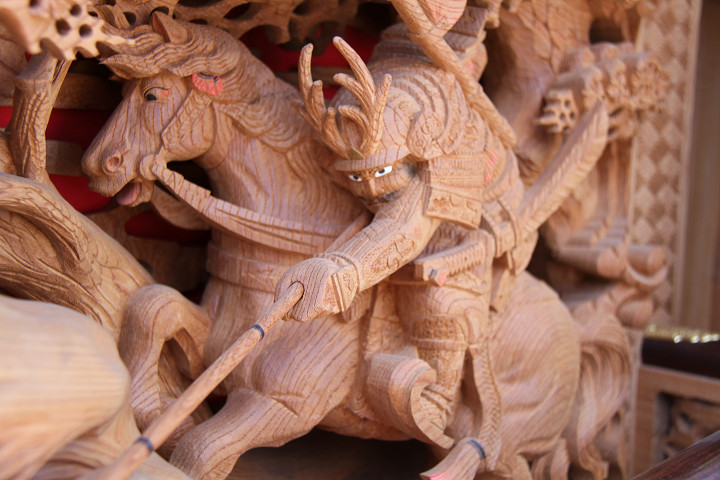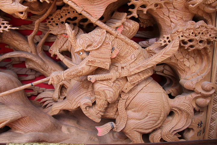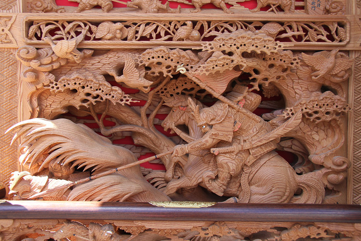 | 前回に引き続き「彫物画廊」と題して陸宮本の彫物を御紹介します。今日は小屋根幕板右面の題材である「槍摺乃鎧」を御紹介します。小屋根幕板右面は以前、コンデジで撮影した画像を御紹介済ですが一眼レフカメラで撮影した画像を改めて御紹介しようと思います。その前にまずは「槍摺乃鎧」の題材について。 |