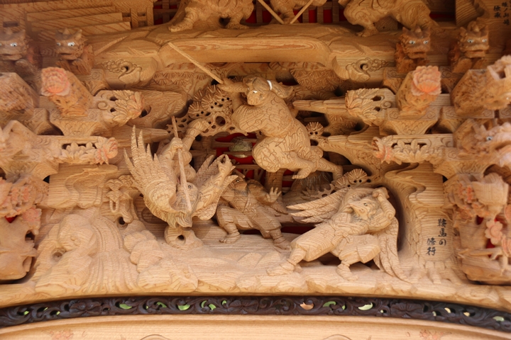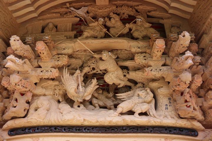 | 前回に引き続き「彫物画廊」と題して山中渓の彫物を御紹介します。今回は小屋根桝合正面の題材である「鞍馬の修行」を御紹介します。その前にまずは「鞍馬山 牛若丸修行の場」の題材について。 |
