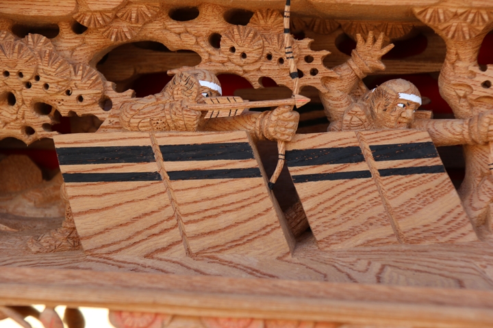 | 前回に引き続き「彫物画廊」と題して山中渓の彫物を御紹介します。今回は大屋根欄間右面の題材である「弁慶の仁王立ち」を御紹介します。その前にまずは「衣川の戦い」の題材について。 |