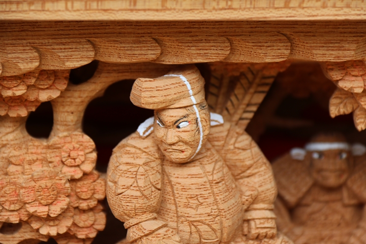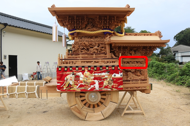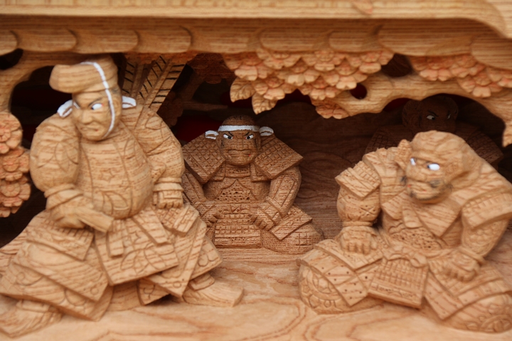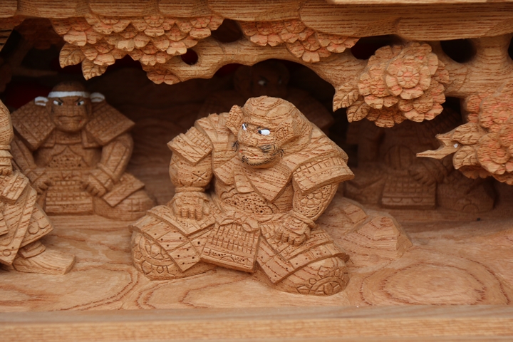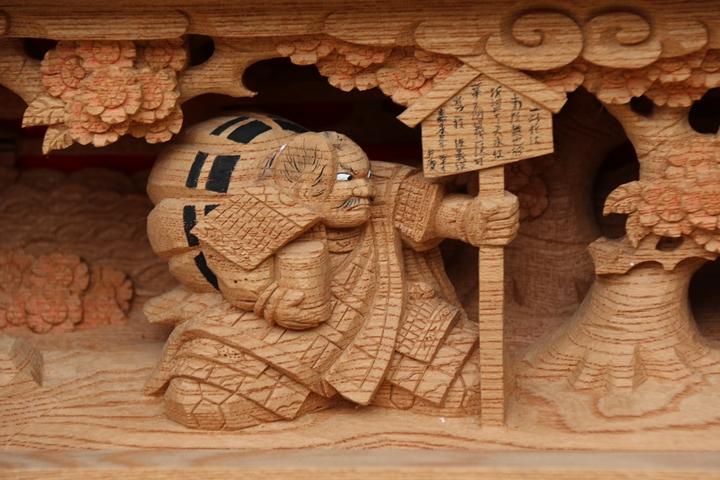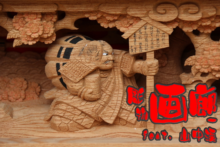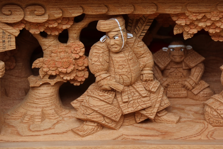 | 前回に引き続き「彫物画廊」と題して山中渓の彫物を御紹介します。今回は小屋根欄間左面の題材である「若木桜の高札」を御紹介します。その前にまずは「平景清 錣引き」の題材について。 |