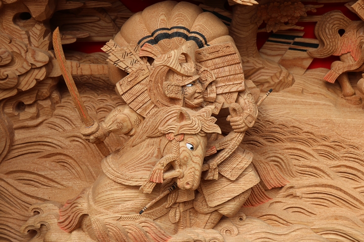 | 前回に引き続き「彫物画廊」と題して山中渓の彫物を御紹介します。今回は小屋根幕板左面の題材である「敦盛を呼び戻す」を御紹介します。その前にまずは「一ノ谷の戦い」の題材について。 |