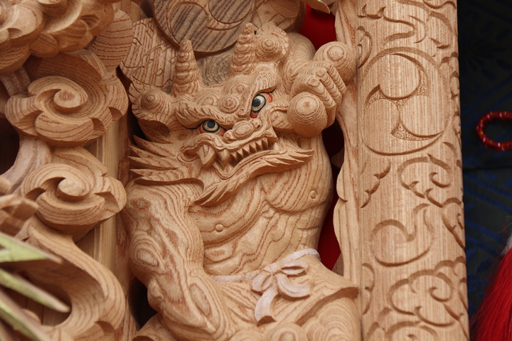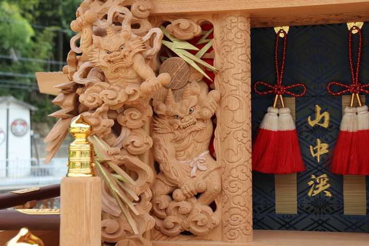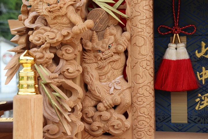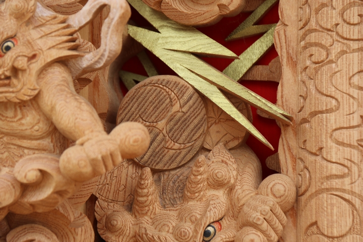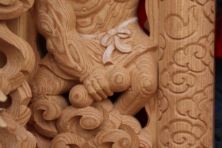 | 前回に引き続き「彫物画廊」と題して山中渓の彫物を御紹介します。今回は大屋根小脇板左の題材である「風神雷神」を御紹介します。その前にまずは「風神雷神」の題材について。 |