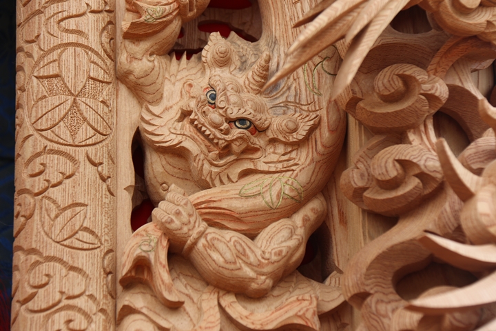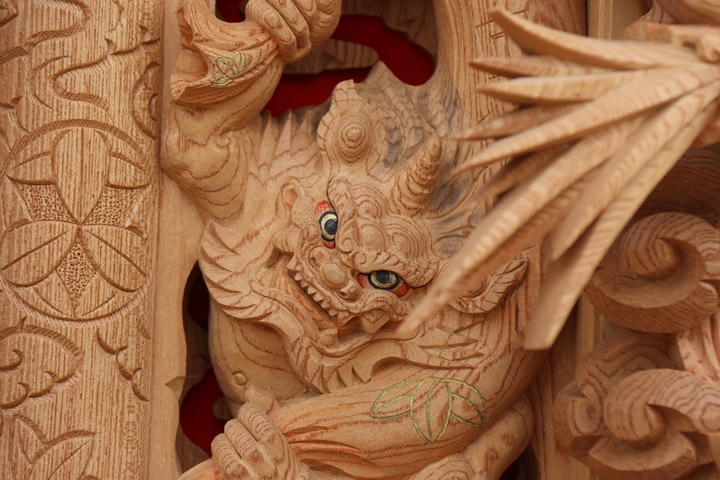 | 前回に引き続き「彫物画廊」と題して山中渓の彫物を御紹介します。今回は大屋根小脇板右の題材である「風神雷神」を御紹介します。その前にまずは「風神雷神」の題材について。 |