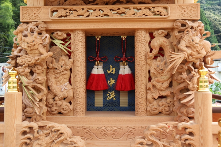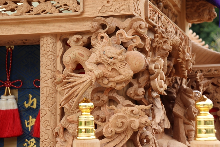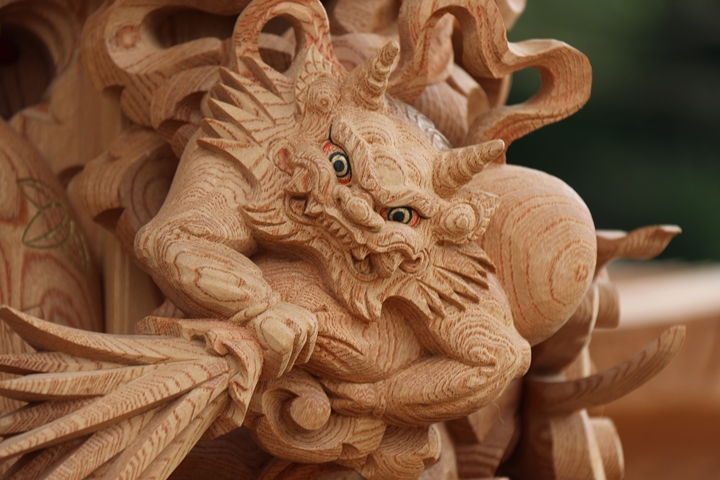 | 前回に引き続き「彫物画廊」と題して山中渓の彫物を御紹介します。今回は大屋根柱巻右の題材である「風神雷神」を御紹介します。その前にまずは「風神雷神」の題材について。 |