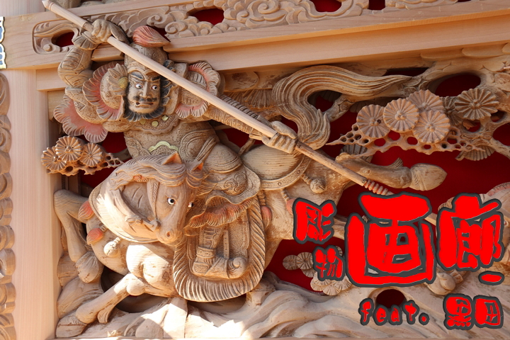 | 今回から「彫物画廊」と題して約7ヶ月前の今年3月10日(日)に撮影した黒田の彫物を約4ヶ月ぶりに御紹介します。まず今日は大屋根幕板右面の題材である「山陣に徐寧 釣鎌槍を使う」を御紹介します。その前にまずは「金鎗手徐寧」の題材について。 |
