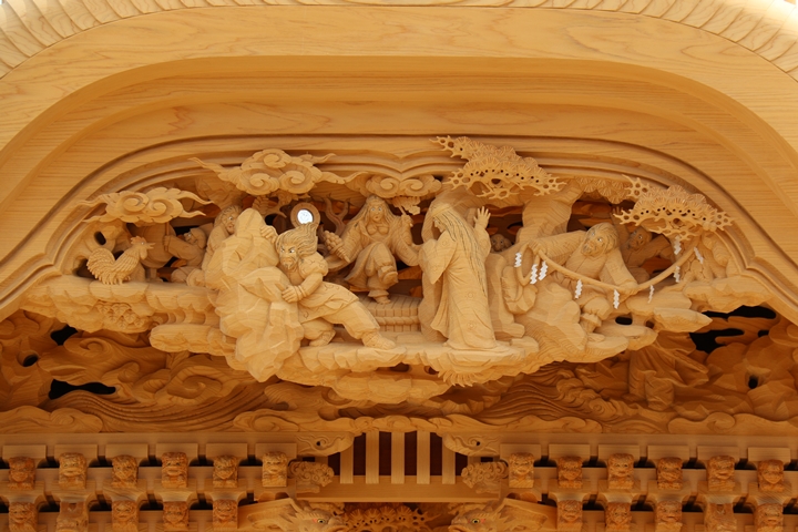 | 前回に引き続き「彫物画廊」と題して新町の彫物を御紹介します。今回は大屋根懸魚正面の題材である「天照大神天岩戸隠れ」を御紹介します。その前にまずは「天の岩戸」の題材について。 |