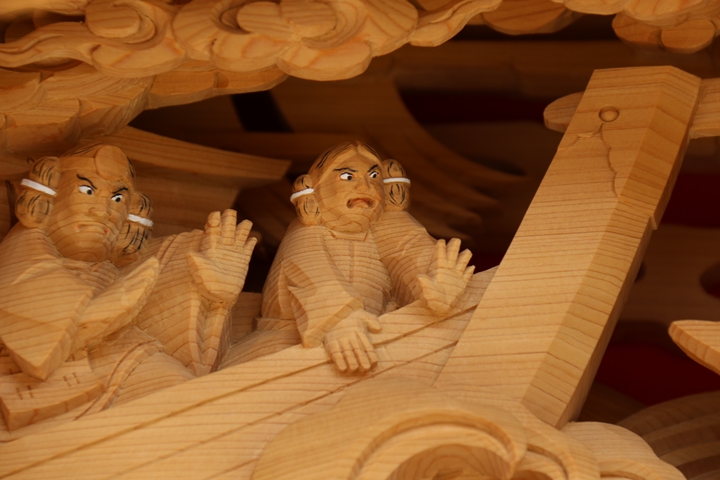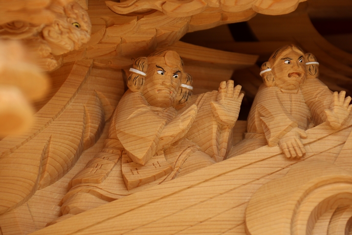 | 前回に引き続き「彫物画廊」と題して新町の彫物を御紹介します。今回は小屋根桝合右面の題材である「弟橘姫荒波を鎮める為入水」を御紹介します。その前にまずは「倭姫命」の題材について。 |
