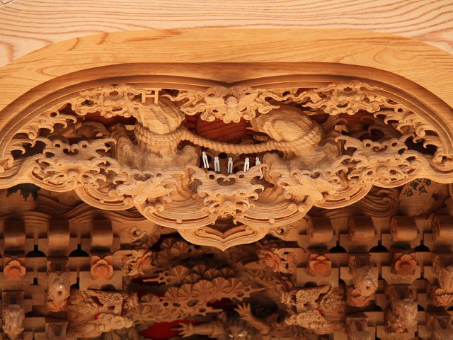 | 近年新調したやぐらの【やぐらの顔】を御紹介する「彫物研究」、今回は「懸魚(ゲギョ)」を御紹介しようと思います。懸魚は古来より神社仏閣の屋根には必ず下がっており、火に弱い木造の建物を火災から守るためのもので火除けのまじないとして取り付けられているのが由来です。 やぐらにも大屋根正面、大屋根後面、小屋根正面の三箇所に必ず懸魚が取り付けられています。当企画は"やぐらの顔"である大屋根正面の懸魚のみを御紹介する予定でしたが、大屋根後面や小屋根正面にも題材が異なる立派な懸魚が取り付けられているのでせっかくですし三箇所全ての懸魚を御紹介しようと思います。 |