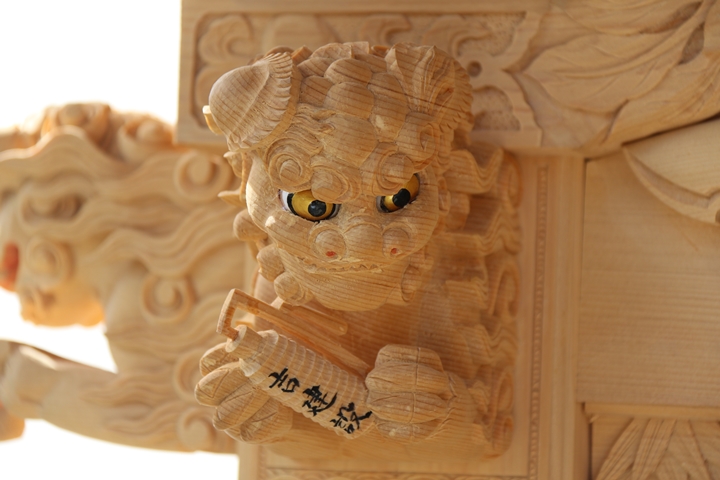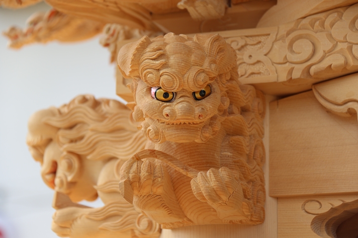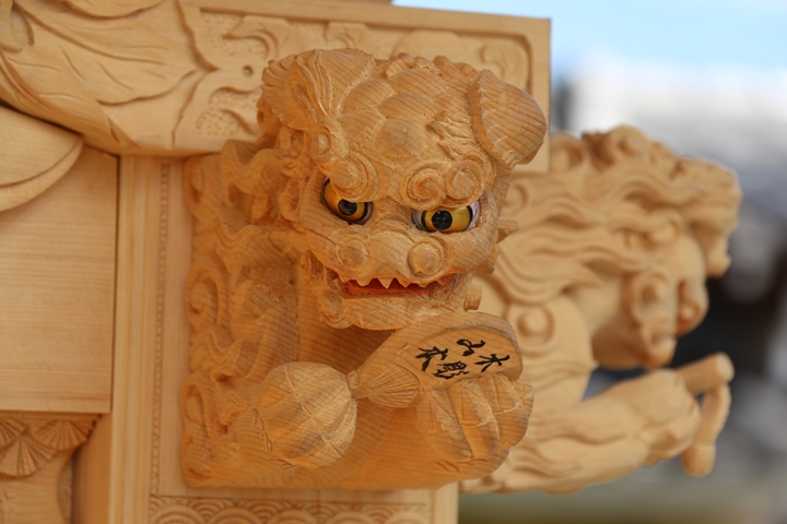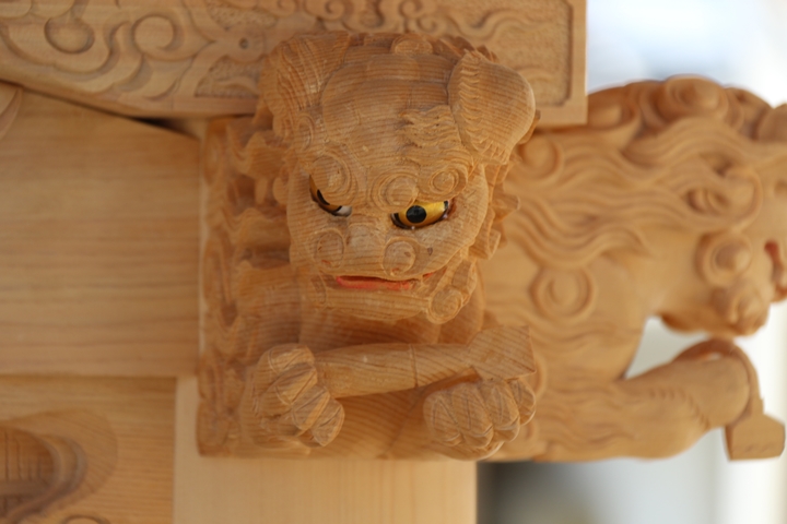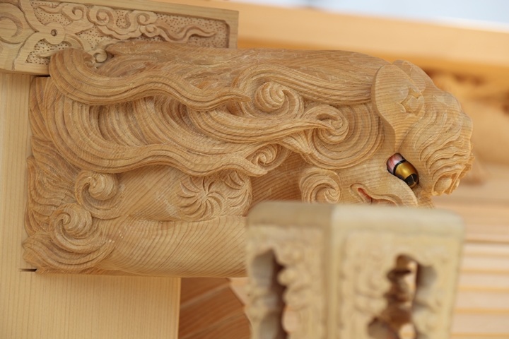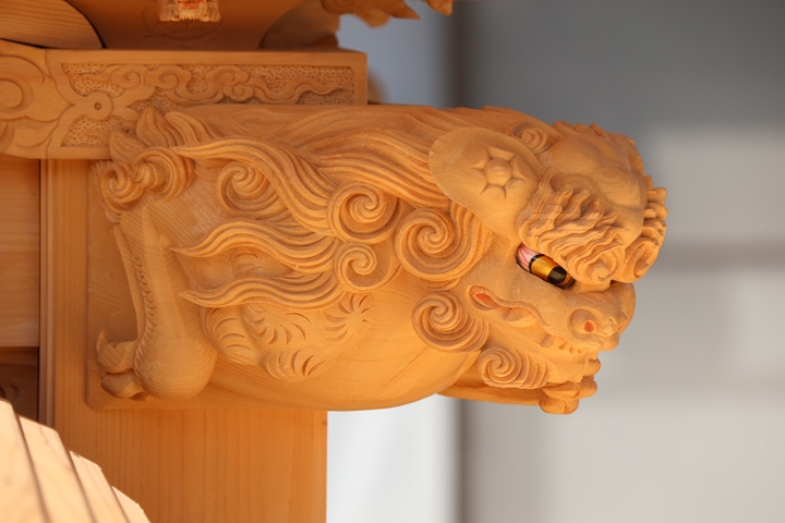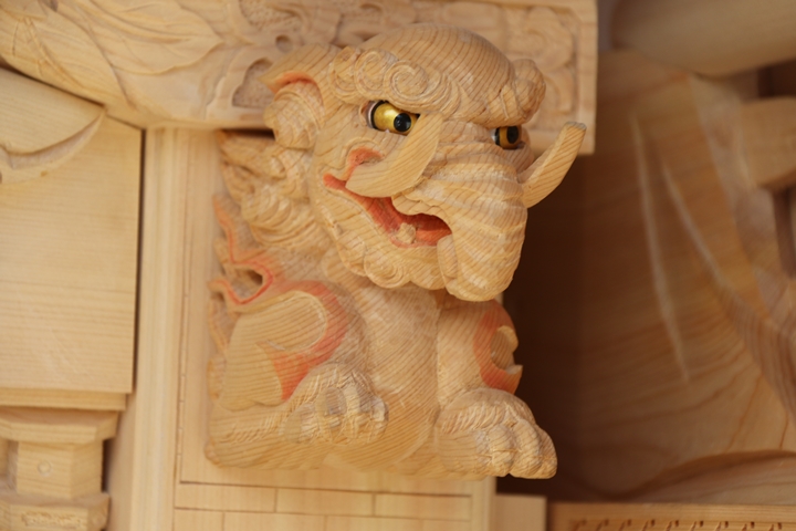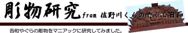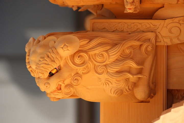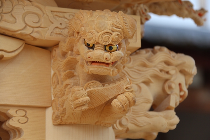 | 先日、「彫物研究」と題して山中渓の木鼻を御紹介しましたがせっかくなのでその流れから自然田上組の木鼻を御紹介しようと思います。山中渓の木鼻、大屋根右面後と後面右の「阿形の唐獅子」、大屋根左面後と後面左の「吽形の唐獅子」が一緒なのが特徴、今までにないユニークな木鼻です。 | |