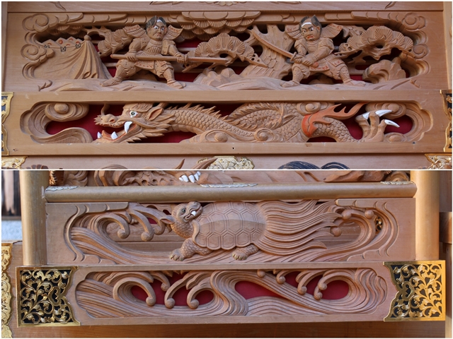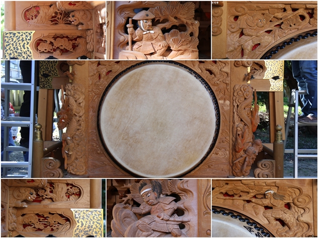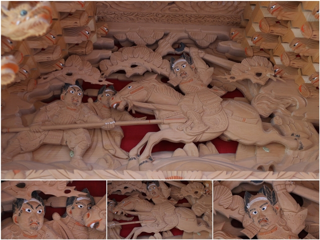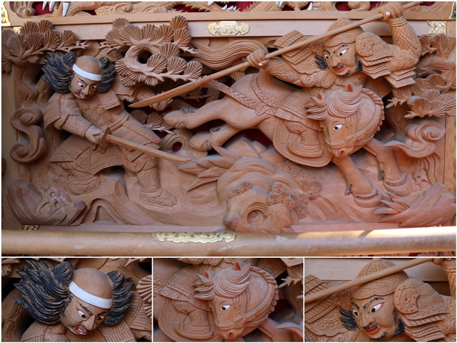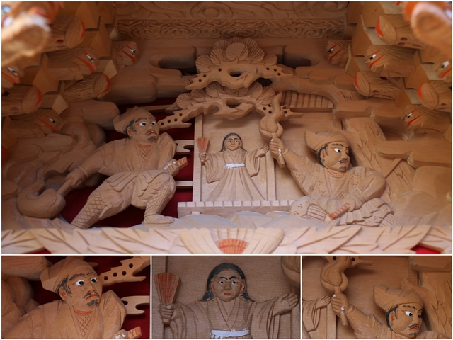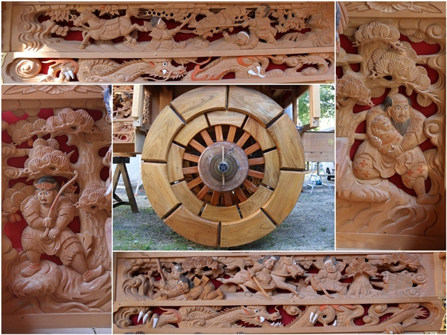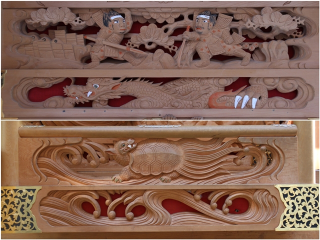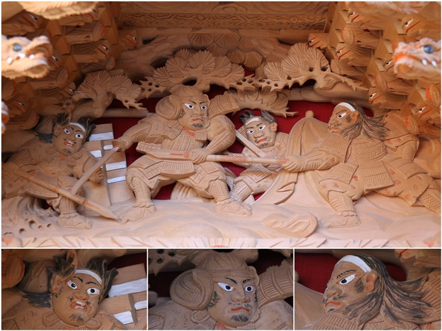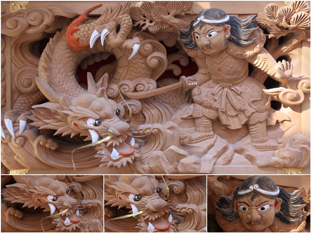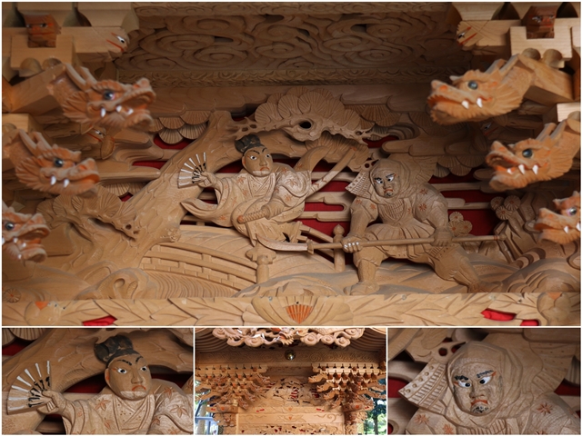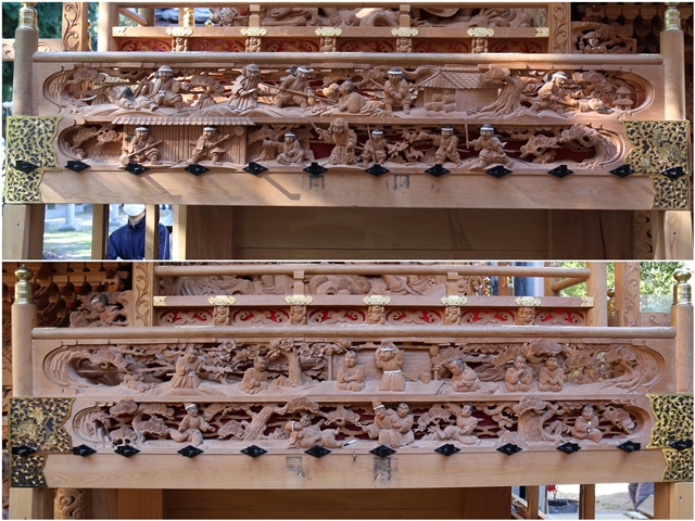 ![]() ▲ まずはやぐら本体の正面と後面。 ![]() ▲ 次いで右平。 ![]() ▲ そして左平。 ![]() ▲ ココからは各箇所の彫物、まずはやぐらの顔とも言える鬼板三面。 ![]() ▲ 次いで懸魚三面。 ![]() ▲ 次いで車板三面。 ![]() ▲ ココからは大屋根正面、まずは桝組・欄間・そして小脇板。 ![]() ▲ 続いて桝合「天の岩戸」。 ![]() ▲ 次いで擬宝珠勾欄・犬勾欄・板勾欄・縁葛。 ![]() ▲ ココからは大屋根右面、まずは桝合。 ![]() ▲ そしてやぐらのメインの彫物である幕板。 ![]() ▲ 右面・左面の板勾欄・縁葛。 ![]() ▲ 大屋根左面に移ります。まずは桝合。 ![]() ▲ そして幕板二面目。 ![]() ▲ 右面・左面の欄間、脇障子、そして駒。 ![]() ▲ 大屋根八ヶ所の木鼻。 ![]() ▲ ココからは小屋根へ、まずは小屋根桝合正面「牛若丸弁慶 五条大橋の出会い」。 ![]() ▲ ココからは小屋根右面、まずは桝合「曽我兄弟 工藤が寝所に忍ぶ」。 ![]() ▲ 幕板三面目「天竺の班足王」。 ![]() ▲ 上から欄間、板勾欄、縁葛。 ![]() ▲ 最後に小屋根左面に移ります。まずは桝合「新田義貞 稲村ヶ崎宝剣を奉ず」。 ![]() ▲ 幕板四面目「素戔嗚尊 大蛇退治」。 ![]() ▲ 上から欄間、板勾欄、縁葛。 ![]() ▲ 小屋根六ヶ所の木鼻。 ![]() ▲ 大屋根板勾欄後面、脇障子犬勾欄、そして太鼓廻り。 ![]() ▲ 大屋根、小屋根の柱巻き。 ![]() ▲ 最後に本幕。 … |