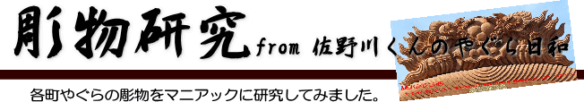 | 私が毎日欠かさずチェックしているブログが「板原村のだんじり会館」、特にだんじりレポと題して各町のだんじりの彫物を詳しく紹介されています。当サイトでも「やぐらの彫物図鑑」と題して各町の彫物を御紹介していますがよくよく考えれば100枚超の写真を交えての彫物紹介。そこで板原村さんの様に少しコンパクトに紹介してみようと思い今回、「彫物研究」と題して箱作東の彫物を編集してみました。箱作東の彫物は既に「やぐらの彫物図鑑」にて御紹介済ですが改めて103枚の写真を27枚にまで整理しつつ箱作東の魅力を余すところなく御紹介してみました。 | |