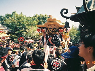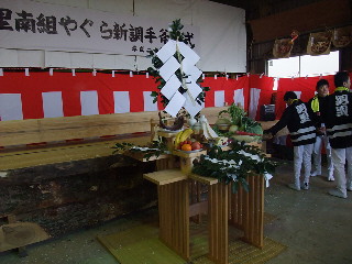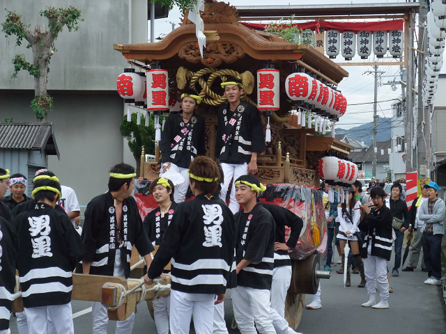 平成8年まで平成8年まで鳥取中のやぐらとして曳行されてました。 平成6年8月21日関西国際空港開港記念の1万人の大見学会のイベントで、堺以南9市4町の郷土芸能が披露され阪南市代表として鳥取中の先代のやぐらが参加しました。 平成9年10月5日鳥取中から男里南組へ曳き入れ譲渡されました。 平成16年10月8日男里やぐら復興30周年記念曳行として、宵宮の前日にやぐらが曳かれました。 平成17年10月2日男里北組,男里南組,朝日町やぐら連合曳きに、この年のみ濱中講のやぐらも参加しました。 平成21年1月25日平成23年新調予定のやぐらの手斧始式が行われました。 |