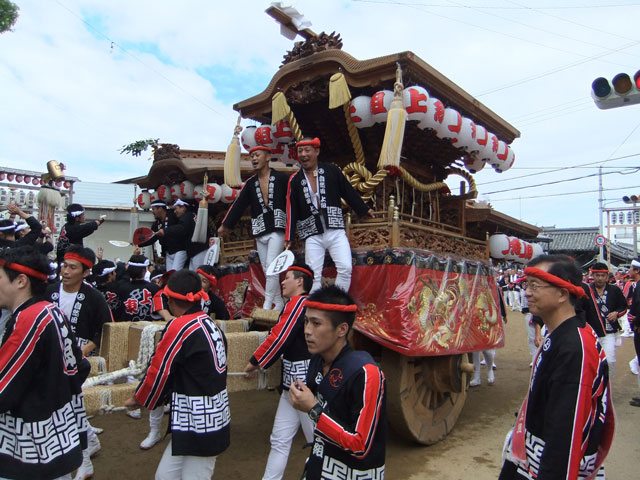 (じねんだかみぐみ・東鳥取五地区) ・新調:大正12年 ・大工:有岡製作所 ・彫師:不明 ・彫物:下記「彫物図柄解説」参照 ・本幕:川島織物(大丸心斎橋店調整) ・宮入:波太神社 ◎ 地名「自然田」の由来 自然田の地名の由来は小川,山中川などの流域地域であり、自然に田ができたので自然田と銘々されました。謡曲で知られる自然居士の出生地でもあります。その自然田は安政6年(1859年)頃は上出,寺脇,東,南,芝の5つにわかれ、やぐらも5台ありましたが、集約され上出(上出,寺脇−今の自然田上組)、中之場(東,南−今の自然田東組)、 芝出(芝−今の自然田上東組)の3台になりました。 ◎ 先代のやぐら 先代のやぐらは大正8〜9年まで曳行。焼却か?売却か?不明であるが、売却ならば信達葛畑へ売却したと思われます。 ◎ 現在のやぐら 現在のやぐらは大正12年に地元の大工:有岡製作所によって新調しました。また提灯は白地に赤の文字で「上組」という文字です。なお自然田上組はしばしば「上久美」とゴロ合わせされています。 ◎ 新調予定のやぐら 平成30年を目処に、やぐらを新調予定。 ◎ 彫物図柄解説 【大屋根廻り】 ・鬼板 − 獅噛み ・懸魚 − 正面:鳳凰、 後面:松に鷲 ・車板 − 正面:阿吽の唐獅子、 後面:牡丹 ・枡合 − 正面:浅蜊,宝珠、 右:小判,宝珠,枡、 左:小槌,巻物,手鞠、 後面:? ・虹梁 − 牡丹に若葉 ・欄間 − 正面:?、 右:?、 左:? ・長押 − 雲海 ・柱巻 − 右:昇り龍、 左:降り龍 ・小脇板 − 右:?、 左:? ・幕板 − 右:?、 左:? ・脇障子 − 右:?、 左:? ・兜桁 − 「上組」の文字 ・犬勾欄 − 正面:阿吽の唐獅子、 右:玄武、 左:玄武 ・擬宝珠勾欄 − 勾欄合:波濤、 束:力神 ・内勾欄 − 阿吽の唐獅子 ・板勾欄 − 正面:?、 右:?、 左:? ・縁葛 − 正面:鯛車曳き、 右:楽器遊び、 左:鬼ごっこ 【唐子遊び】 【小屋根廻り】 ・鬼板 − 獅噛み ・懸魚 − 雲龍 ・車板 − お面遊び 【唐子遊び】 ・枡合 − 正面:素盞嗚尊 八岐大蛇退治、 右:神功皇后 弓末で文字を刻む、【神話伝説】 左:新田義貞 稲村ヶ崎宝剣を奉ず 【太平記】 ・虹梁 − 牡丹に若葉 ・欄間 − 右:?、 左:? ・長押 − 雲海 ・太鼓周り − 牡丹に唐獅子 ・幕板 − 右:牛の皮を被り 頼光を狙う鬼童丸、 左:藤原保昌朝臣 盗人袴垂に会う 【頼光一代記】 ・板勾欄 − 右:波濤、 左:波濤 ・縁葛 − 波濤 【本幕】 ・本幕 − 正面:波間に上組の文字、 右:波間に雲龍、 左:竹に虎 ◎ 曳行パターン ・パレード − パレードの日は森下酒店前にて和泉鳥取,山中渓,自然田東組,自然田上東組と合流、サークルK阪南鳥取中店前にて石田宮本,黒田,下出,鳥取中と合流し9町でパレードに参加、帰りは和泉鳥取,山中渓,自然田東組,自然田上東組と一緒に帰路につきます。 ・本宮 − 本宮は午前からところ曳きと波太神社への宮入が、波太神社への宮入は自然田東組,自然田上東組と一緒に曳行します。夜は水本運送で自然田東組,自然田上東組と一緒に曳行します。 ・後宮 − 後宮は午前からところ曳きが、夜は水本運送にて自然田東組、自然田上東組と一緒に曳行します。 ・東鳥取五地区パレード − 波太神社宮入の時間によって異なりますが、本宮か後宮に和泉鳥取,山中渓,自然田東組,自然田上東組の5台で、各年持ち回りで和泉鳥取,山中渓,自然田地区をパレードします。 ◎ 自然田上組の略年表 ・大正8〜9年−先代のやぐらを売却。 ・大正12年−現在のやぐらを新調。 ・平成2年11月12日月曜日−天皇陛下御即位の礼に伴う記念曳行を実施。 ・平成5年6月9日水曜日−皇太子殿下御成婚に伴う記念曳行を実施。 ・平成6年10月11日火曜日−自然田東組,自然田上東組と御神輿担当に当たる。 ・平成7年10月−本幕を新調。 ・平成14年10月−法被を新調。 ・平成14年10月14日月曜日−自然田東組,自然田上東組と御神輿担当に当たる。 ・平成15年9月7日日曜日−駒を新調、自然田住民センター前にて自然田上東組と合同で入魂式を実施。 ・平成15年9月28日日曜日−駒を新調、波太神社にて入魂式を実施。 ・平成22年10月11日月曜日−自然田東組,自然田上東組と御神輿担当に当たる。 ◎ 瑞寶寺寺入りについて 自然田上組やぐら部屋前にある瑞寶寺、かつては波太神社へ宮入りせず各町で宮入り儀式を行い、やぐらは瑞寶寺へ寺入りしてました。 ◎ 自然田上組関連サイト ・阪南市の祭・やぐら → http://yagura.fan-site.net ・優雅・伝統・秋祭り → http://sazern9.fc2web.com ・自然田上組青年団 → http://www.geocities.co.jp/Milkyway-Lynx/1983/ |