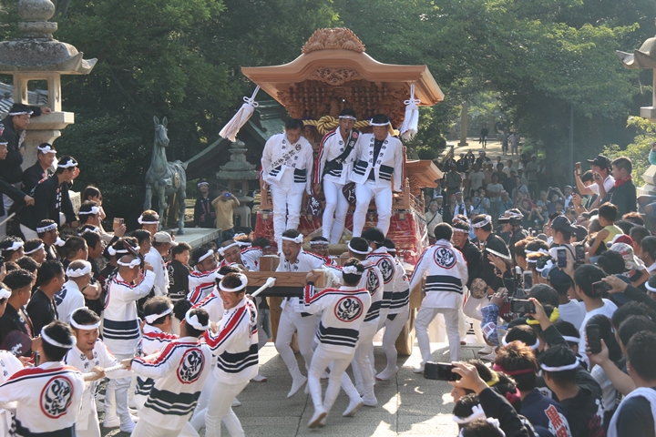 | ● 山中渓 (やまなかだに・東鳥取五地区) ・新調:令和元年 (同年8月25日入魂式) ・大工:井上工務店 ・彫師:木彫片山・木彫前田工房 ・本幕:紀繍乃や ・太鼓:浅野太鼓楽器店 ・宮入:波太神社 ◎ 地名「山中渓」の由来 山中は名前の通り山間の間にできた地区で平安時代の熊野参詣が盛んな頃に宿場町が形成し、昭和5年JR阪和線開通から昭和後期まで温泉町として発展しました。昭和47年の阪南町合併の際に山中から山中渓に改称されました。 ◎ 先々代のやぐら 山中渓にはかつては3台あったと伝えられてます。そして先々代のやぐらは新家の中村より購入、その後村で解体し彫り物は分けたと伝えられる。 ◎ 先代のやぐら 先代のやぐらは明治時代初期に信達岡中のやぐらとして新調、明治時代末期から大正時代初期にかけて信達岡中から購入、その後地元の大工:米澤清五郎師によって大修復が施されました。ちなみに山中渓は戦後1回だけ波太神社へ宮入しただけでその後はところ曳きだけでしたが、平成5年に48年ぶりに波太神社への宮入を再開しました。令和元年5月12日に山中神社にて昇魂式を実施、令和2年12月6日にお別れ見学会を実施した後に解体、令和3年1月24日よりわんぱく王国管理棟に展示されています。 ◎ 現在のやぐら 平成27年11月8日日曜日に井上工務店にて新調釿始式を実施、令和元年に大工:井上工務店、彫師:木彫片山・木彫前田工房によって新調、同年8月25日日曜日に波太神社にて入魂式を挙行しました。また提灯は白地に赤の文字で「山中」という文字です。 ◎ 彫物図柄解説 【大屋根廻り】 ・鬼板 − 獅噛 ・箱棟 − 雲龍 ・懸魚 − 正面:波に御来光、 後面:波に鶴亀 ・車板 − 正面:神武東征 【神話伝説】、 後面:恵比須天,大黒天 【七福神】 ・小屋虹梁 − 桜に若葉 ・飛檐垂木 − 九枚笹紋 【波太神社御神紋】 ・地垂木 − 「山中」の文字 ・隅出 − 正面右:青龍、 正面左:朱雀、 後面右:白虎、 後面左:玄武 【四神獣】 ・枡組 − 尾垂木:龍首、 肘木:麒麟,獅子,桜,牡丹 【三手先八段】 ・枡合 − 正面:饒速日命 天孫降臨、 右面:大蛇退治、 左面:天の岩戸、 後面:(山中神社祭神)天之忍穂耳命 木考幡千千姫命 【神話伝説】 ・横槌 − 松竹梅 ・台輪 − 雲海 ・虹梁 − 正面:若葉、 右:桜に若葉、 左:桜に若葉 ・木鼻 − 正面右:亀を持つ唐獅子、 正面左:瓢箪を持つ唐獅子、 右前:提灯を持つ唐獅子、 左前:篠笛を持つ唐獅子、 右後:子獅子を抱く唐獅子、 左後:太鼓を持つ唐獅子、 右後面:獏、 左後面:獏 ・欄間 − 正面:大江山 鬼退治、 右面:弁慶の仁王立ち、 左面:朽ち木隠れ 【源平盛衰記】 ・長押 − 正面:松に鷹、 右面:梅に山鵲、 左面:竹に雀 ・柱巻 − 右:雷神、 左:風神 ・小脇板 − 右:雷神、 左:風神 ・幕板 − 右面:白龍昇天、 左面:巴御前 【源平盛衰記】 ・脇障子 − 右面:白龍昇天、 左面:巴御前 【源平盛衰記】 ・兜桁 − 右面:山中紋 ・竹の節 − 右:福禄寿、 左:布袋 【七福神】 【腰廻り】 ・犬勾欄 − 正面:那須与一、 右面:波濤に大工 井上工務店立札、 左面:波濤に彫刻責任者 木彫片山,木彫前田工房立札 ・内勾欄 − 正面:五条大橋 ・擬宝珠勾欄 − 勾欄合正面:桜に目白、 右面:梅に鶯,竹に雀,松に鶴、 左面:松に鶴,竹に雀,梅に鶯、 束:「山中」の文字 ・板勾欄 − 正面右:源氏 源頼朝、 正面左:平家 平清盛、 右面:義経 千本桜、 左面:布引の滝 【源平盛衰記】、 後面右:毘沙門天、 後面左:寿老人 【七福神】 ・縁板 - 山中渓石畳文様 ・縁葛 − 正面:波濤 【小屋根廻り】 ・鬼板 − 獅噛 ・箱棟 − 雲龍 ・懸魚 − 雲龍 ・車板 − 白鳥の関 【雄ノ山峠伝承】 ・飛檐垂木 − 左三つ巴紋 【波太神社御神紋】 ・地垂木 − 「山中」の文字 ・隅木 − 右:左三つ巴紋、 左:九枚笹紋 【波太神社御神紋】 ・隅出 − 獅子 ・枡組 − 尾垂木:龍首、 肘木:麒麟,獅子,桜,牡丹 【二手先六段】 ・枡合 − 後正面:鞍馬の修行、 右面:厳島神社弁財天蘭陵王、 左面:鶴岡八幡宮 静の舞 【源平盛衰記】 ・柄振板 − 若葉に山水 ・台輪 − 雲海 ・虹梁 − 桜に若葉 ・木鼻 − 後正面右:阿形の唐獅子、 後正面左:吽形の唐獅子、 右前:阿形の唐獅子、 左前:吽形の獏、 右後:吽形の唐獅子、 左後:阿形の唐獅子 ・欄間 − 右面:景清の錣引き、 左面:若木桜の高札 【源平盛衰記】 ・長押 − 右面:梅に山鵲、 左面:梅に山鵲 ・太鼓廻 − 花咲爺 ・四本柱 − 青海波に牡丹 ・幕板 − 右面:義経の八艘飛び、 左面:敦盛を呼び戻す 【源平盛衰記】 ・擬宝珠勾欄 − 勾欄合右面:葦に葭切,楠に梟,樫に鴉、 左面:樫に鴉,楠に梟,葦に葭切、 束:「山中」の文字 ・縁板 - 山中渓石畳文様 ・縁葛 − 右面:波に龍、 左面:波に龍 【本幕】 ・本幕 − 正面:富士全景、 右面:頼朝本陣、 左面:仁田四郎 猪退治 【富士の巻狩り】 ◎ 曳行パターン ・パレード − パレードの日は森下酒店前にて和泉鳥取,自然田上組,自然田東組,自然田上東組と合流、ファミリーマート阪南鳥取中店前にて石田宮本,黒田,下出,鳥取中と合流し9町でパレードに参加、帰りは和泉鳥取,自然田上