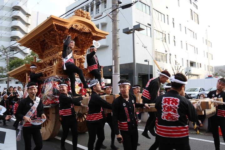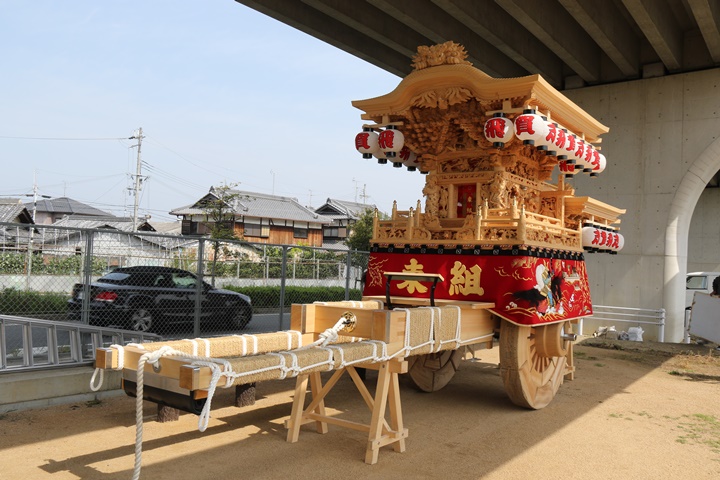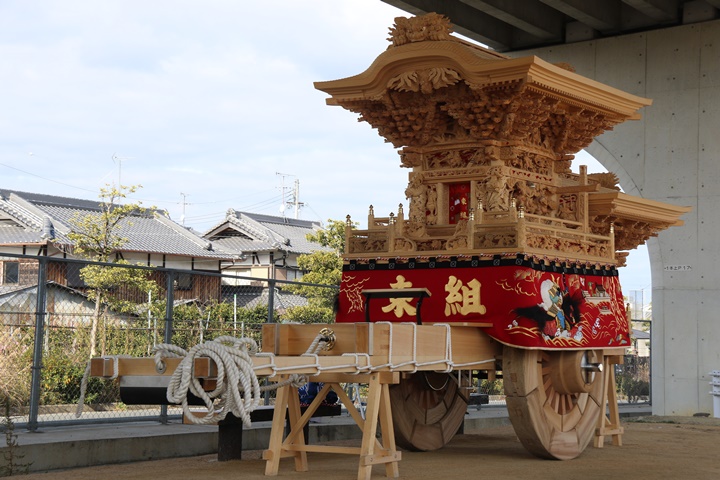 | ● 自然田東組 (じねんだひがしぐみ・東鳥取五地区) ・新調:平成28年 (同年8月21日入魂式) ・大工:植山工務店 ・彫師:木彫岸田 ・本幕:京美刺繍工芸 ・太鼓:三崎屋太鼓店 ・宮入:波太神社 ◎ 地名「自然田」の由来 自然田の地名の由来は小川,山中川などの流域地域であり、自然に田ができたので自然田と銘々されました。謡曲で知られる自然居士の出生地でもあります。その自然田は安政6年/1859年頃は上出,寺脇,東,南,芝の5つに分かれやぐらも5台ありましたが集約されて上出(上出,寺脇−今の自然田上組)、中之場(東,南−今の自然田東組)、 芝出(芝−今の自然田上東組)の3台になりました。 ◎ 先々代のやぐら 先々代のやぐらは大正5,6年頃に信達葛畑に売却されました。 ◎ 先代のやぐら 先代のやぐらは大正9年に大工:大寅(若野寅太郎師)によって新調しました。また屋根の形は正面から眺めた形が軒先部分を撫で肩にし、反りあげた形である唐破風(カラハフ)と呼ばれる形で、これは波太神社拝殿と同様の形をしています。平成27年10月25日に波太神社にて昇魂式を実施、平成28年1月24日日曜日に某倉庫に搬出、平成31年2月10日日曜日に解体されました。 ◎ 現在のやぐら 平成25年6月23日日曜日に植山工務店にて原木祭を実施、平成28年に大工:植山工務店、彫師:木彫岸田によって新調、同年8月21日日曜日に波太神社にて入魂式を挙行しました。また提灯は白地に赤の文字で「飛賀志」という文字です。 ◎ 彫物図柄解説 【大屋根廻り】 ・鬼板 − 獅噛 ・箱棟 − 雲に龍 ・懸魚 − 正面:真向きの朱雀(南方の守護獣)、 後面:波濤に玄武(北方の守護獣) ・桁隠 − 正面:雲、 後面:波濤 ・大屋根桁 − 四方:雲形文様に鳳凰の地彫 ・桁鼻 − 正面・後面左右:鷲に猿 ・車板 − 正面:邇邇藝命 天孫降臨、 後面:神功皇后 三韓征伐 ・飛檐垂木 − 波太神社左三巴紋・九枚笹御神紋に唐草文様金物型地彫 ・地垂木 − 東角字に唐草文様金物地彫 ・隅木 − 右:波太神社九枚笹紋紋御神紋に唐草文様金物型地彫、 左:波太神社左巴紋御神紋に唐草文様金物型地彫 ・隅木受 − 四方:蜃を吐く龍 ・隅木上段 − 四方:雲の籠彫 ・隅木下段 − 正面左右:雲に飛天、 後面左右:雲に龍 ・隅出:− 正面:雅楽を奏でる仙女 後面:見返り龍 ・枡組 − 四手先七段 尾垂木:龍首、 肘木:獏、獅子、菊、梅、牡丹 ・支輪 − 右:雲に三日月、左:雲に満月 ・枡合天井 − 雲海 ・二重枡合:右平 雲に鶴 左平 雲に雁 ・枡合 − 正面:天湯河板挙命 誉津別ノ王に鵠を献じる、 右:鎮西八郎為朝、 左:八幡太郎義家、 後面:神武東征 ・横槌 − 正面:松竹梅、右平:松竹梅、左平:松竹梅 ・台輪 − 菊、 ・木鼻 − 正面右:阿形の唐獅子、 正面左:吽形の唐獅子 右前:子獅子を抱く唐獅子、 左前:鈴を持つ唐獅子、 右後:俵を抱く唐獅子、 左後:剣を持つ唐獅子、 後面右:阿形の唐獅子、 後面左:吽形の唐獅子 ・欄間 − 正面:佐々木高綱・梶原景季 宇治川先陣争い、 右:粟津合戦、 左:一の谷合戦 梶原景季箙の梅、 後面:? ・長押 − 正面:稲穂に雀、、右平:平家蟹、左平:平家蟹 ・柱巻 − 右:倶利伽羅峠の戦い 不動の剣義仲を救う、 左:奥州衣川の戦い 白龍昇天 ・小脇板 − 右:倶利伽羅峠の戦い 不動の剣義仲を救う、 左:奥州衣川の戦い 白龍昇天 ・幕板 − 右:粟津合戦 巴御前・畠山重忠一騎打ち、 左:五条大橋 牛若丸と弁慶の出会い ・脇障子 − 右:粟津合戦 今井四郎兼平勇戦、 左:鞍馬山 大天狗僧正坊 ・内勾欄 − 正面:石橋山合戦 土肥椙山旗揚 ・兜桁 − 右平:九枚笹、左平:巴紋 ・竹の節 − 鯱、源氏紋(笹竜胆)、平氏紋(揚羽蝶) 【腰廻り】 ・犬勾欄 − 正面内右:樋口次郎兼光狒々退治、 正面内左:西塔鬼若鯉退治、 正面外右:黄瀬川対面(源頼朝・畠山重忠)、 正面外左:黄瀬川対面(源義経・武蔵坊弁慶)、 右:竹に虎、 左:牡丹に唐獅子 ・擬宝珠勾欄 − 勾欄合:右平:午、未、申、酉、戌、亥、 左平:子、丑、寅、卯、辰、巳 【十二支】、 束:力神 ・板勾欄 − 正面右:石橋山合戦 真田与一組討ち、 正面左:石橋山合戦 頼朝朽木隠れ、 右:粟津合戦 義仲最後、 左:一の谷合戦 忠度最後 ・縁板 - 花菱 ・縁葛 − 正面:波間に千鳥、 右:波間に千鳥、 左:波間に千鳥、 【小屋根廻り】 ・鬼板 − 獅噛 ・箱棟 − 龍,鳳凰 ・懸魚 − 麒麟 ・車板 − 正面:八俣遠呂智退治 ・飛檐垂木 − 波太神社御神紋(巴紋・九枚笹) ・地垂木 − 東組紋 ・隅木:− 右 巴紋、左 九枚笹紋 ・隅出:− 正面:風神 左:雷神 ・枡組 − 三手先五段 尾垂木:龍首、 肘木:獏、獅子、菊、梅、牡丹 ・枡合天井 − 雲海 ・枡合 − 後正面:天照大神 岩戸隠れ、 右:掘川夜討ち、 左:基盤忠信 ・横槌 − 正面:稲穂に雀、右平:稲穂に蜻蛉、左平:稲穂に蜻蛉 ・柄振板 − 若葉 ・台輪 − 菊 ・木鼻 − 後正面右:阿形の唐獅子、 後正面左:吽形の唐獅子、 右前:扇を持つ唐獅子、 左前:軍配を持つ唐獅子、 右後:勾玉を持つ唐獅子、 左後:鏡を持つ唐獅子 ・欄間 − 正面:悪源太義平・平重盛 紫宸殿の戦い、 右:壇ノ浦の戦い 義経八艘飛び、 左:屋島の戦い 悪七兵景清しころ引 
