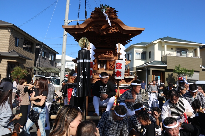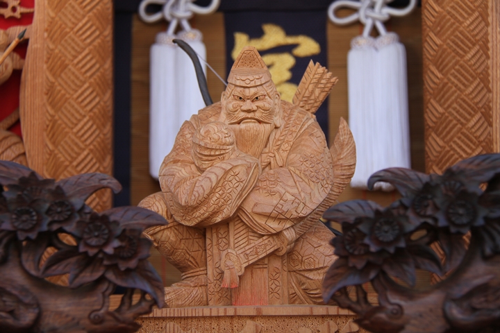 | ● 陸宮本 (くがみやもと・泉南市西信達地区) ・新調:平成20年 (同年9月15日入魂式) ・大工:大下工務店 ・彫師:木下彫刻工芸・木彫片山 ・本幕:不明 (平成6年に太鼓正によって修復) ・太鼓:三浦太幸堂 ・宮入:里外神社 ◎ 先代のやぐら 明治26年に岡田西出のやぐら(先代・岡田西組)として大工:不明、彫刻:西岡一門(彫又)の手によって新調されたやぐらで大正5年に購入。昭和36年まで曳行されましたが昭和37年から昭和50年まで曳行休止。昭和51年から曳行再開され平成20年4月20日日曜日に里外神社にて昇魂式を実施、5月18日日曜日に岬連中へ譲渡されました。 ◎ 現在のやぐら 平成19年5月26日土曜日に手斧始祭を実施、平成20年に大工:大下工務店、彫師:木下彫刻工芸,木彫片山によって新調、同年9月15日月曜日に里外神社にて入魂式を実施しました。また提灯は正面に「宮本」、屋根周りには「宮本」と角に「三ツ巴」。 ◎ 彫物図柄解説 【大屋根廻り】 ・鬼板 − 正面:獅噛み、 後面:獅噛み ・箱棟 − 雲龍 ・懸魚 − 正面:鳳凰、 後面:雲に鶴 ・飛檐垂木 − 「陸」の文字 ・地垂木 − 唐獅子 ・車板 − 正面:天の岩屋戸、 後面:素戔嗚尊 天安河での誓約 【神話伝説】 ・桝組 − 龍,唐獅子,牡丹,獏 ・枡合 − 正面:牛若丸弁慶 五条大橋の出会い、 右平:頼朝初陣、 左平:春の夜の夢 (平清盛沈む夕日を呼び戻す)、 後面:頼朝義経 黄瀬川の対面 【源平盛衰記】 ・木鼻 − 妻:唐獅子、 平:獏 ・虹梁 − 若葉 ・欄間 − 正面:粟津合戦 義仲の奮戦、 右平:宇治川 先陣争い、 左平:巴御前 畠山重忠一騎打ち 【源平盛衰記】 ・長押 − 妻:松に山鵲、 平:梅に山鵲 ・柱巻 − 右:昇龍、 左:降龍 ・小脇板 − 右:吉野山合戦 佐藤忠信、 左:吉野山合戦 横川覚範 【源平盛衰記】 ・御簾 − 里外神社御神紋に宮本の文字 ・幕板 − 右平:堀川夜討、 左平:熊谷直実 敦盛呼び戻す 【源平盛衰記】 ・脇障子 − 右:梶原景季 箙の梅、 左:愛馬を背負う畠山重忠 【源平盛衰記】 ・兜桁 − 里外神社御神紋 ・番号持(札差) − 誉田別命(応神天皇)を抱く武内宿禰 【腰回り】 ・犬勾欄 − 正面右:悪七兵衛景清、 正面左:三保谷四郎 【源平盛衰記】 ・擬宝珠勾欄 − 勾欄合:花鳥、 束:社紋 ・内勾欄 − 屋島の合戦風景 【源平盛衰記】 ・板勾欄 − 正面右:義経の弓流し、 正面左:那須与一 扇の的を射る、 右平:壇ノ浦 義経八艘飛び、 左平:安宅の関 【源平盛衰記】 ・縁葛 − 波に龍 【小屋根廻り】 ・鬼板 − 正面:獅噛み ・箱棟 − 雲龍 ・懸魚 − 正面:松に鷹 ・檐垂木 − 「陸」の文字 ・地垂木 − 唐獅子 ・車板 − 獅子の子落とし ・枡合 − 正面:冬の陣 講話誓詞交換、 右平:木村重成 単騎部下を助ける、 左平:坂崎出羽守 千姫救出 【難波戦記】 ・木鼻 − 妻:唐獅子、 平:獏 ・虹梁 − 若葉 ・欄間 − 右平:夜討ちの大将 塙団右衛門、 左平:幸村の計略 平野の地雷火 【難波戦記】 ・長押 − 粟に鶉 ・太鼓廻り − 獅子の子落とし ・幕板 − 右平:槍摺乃鎧(幸村に追われ葦に隠れる家康)、 左平:半田寺山(家康落命) 【難波戦記】 ・板勾欄 − 右平:真田大助 初陣、 左平:本田忠朝 荒川熊蔵一騎討ち 【難波戦記】 ・縁葛 − 波に龍 【本幕】 ・本幕 − 正面:「宮本」の文字、 右平:武内宿禰、 左平:神功皇后 【神功皇后三韓征伐】 ◎ 曳行パターン ・宵宮:ところ曳き、西信達パレード ・本宮:ところ曳き、里外神社へ宮入 ◎ 陸宮本の略年表 ・明治26年−岡田西出のやぐらとして新調。 ・大正5年−岡田西出からやぐらを購入。 ・昭和37年から昭和50年−曳行休止。 ・昭和51年−曳行再開。 ・平成3年−貴田組によって"平成の大修復"を実施。 ・平成4年−太鼓正によって太鼓を新調。 ・平成6年−貴田組によって台場,駒を新調。 ・平成6年−太鼓正によって本幕を修復。 ・平成12年−桝組締め直し。 ・平成13年−太鼓張替え。 ・平成14年−洗い,色付。 ・平成19年5月26日−やぐら新調手斧始祭を実施。 ・平成20年4月20日−昇魂式を実施。 ・平成20年5月18日−先代やぐらを岬連中へ搬出。 ・平成20年9月7日−大下工務店よりやぐらを搬入。 ・平成20年9月15日−やぐらを新調、里外神社にて入魂式を実施。 ・平成20年9月23日−やぐら新調記念誌撮影会を実施。 ・平成20年9月27日−先代やぐら、岬連中南組として御清め式を実施。 ・平成21年6月27日−やぐら新調寄付者芳名板を設置。 ・平成21年6月−やぐら新調記念誌を発刊。 ・平成26年10月−番号持を追加。 ・平成28年6月19日日曜日−駒を旋盤、試験曳きを実施。 ・令和2年−新型コロナウイルス感染症対策として曳行自粛。 ・令和3年−新型コロナウイルス感染症対策として曳行自粛。 ◎ その他の補足 岡田は元々海手である「浦」(やぐらでは岡田西組,岡田中組,岡田北組)と、山手である「陸」に分かれており、山手にある里外神社に宮入りする事から陸宮本と呼ばれている。ちなみに里外神社に宮入りする4台のやぐらの中で、宮一番の特権がある。 |