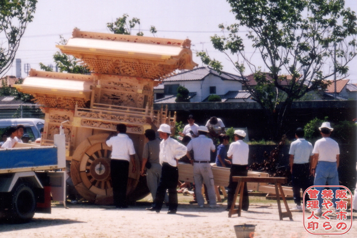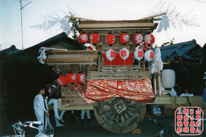… ![]() 先代やぐら。 ![]() 平成4年9月6日 − やぐらを組み立て。 ![]() 平成4年10月8日 − やぐらを新調、入魂式を実施。 ![]() 平成17年10月26日 − イタリア留学生の海外文化交流やぐら曳行を実施。 ![]() 平成18年9月23日 − 駒を新調、入魂式を実施。 ![]() 平成26年9月21日 − やぐらを大修復、御披露目曳行を実施。 ![]() 平成26年9月 − 提燈のデザインを変更。 |