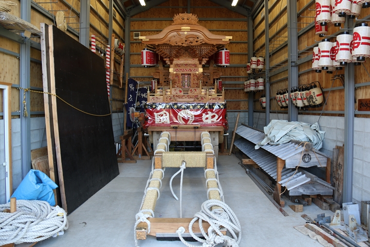 | ● 岡中 (おかなか・泉南市信達地区) ・新調:平成10年(同年10月3日入魂式) ・大工:安田建設 ・彫師:木下彫刻工芸 ・本幕:川島織物 ・太鼓:不明 ・宮入:岡中鎮守神社 ◎ やぐらの歴史 三先代やぐらは明治時代初期に新調、明治時代末期に山中渓の売却され令和元年5月12日に山中神社にて昇魂式を実施しました。先々代やぐらは明治時代末期に新調、昭和9年頃に樽井の個人へ売却後、翌昭和10年に男里北組へ売却され現在でも曳行中。先代やぐらは昭和6年頃に彫師:開正藤師,開生a師,宮沢厳師によって新調、平成10年に解体処分され彫物の一部は岡中鎮守神社境内へ保存中。 ◎ 現在のやぐら 平成10年に大工:安田建設、彫刻:木下彫刻工芸によって新調、同年10月3日岡中鎮守神社にて新調入魂式を挙行しました。新調当時は梶台にナルを付けてましたが、現在ではナルを取り外してます。提燈は泉南市で唯一の駒提灯で「岡中」のロゴ。 ◎ 彫物図柄解説 【大屋根廻り】 ・鬼板 − 獅噛み ・箱棟 − 雲海に龍 ・懸魚 − 正面:鳳凰、 後面:雲に鶴 ・車板 − 正面:石橋山合戦、 後面:宇治川 先陣の争い 【源平盛衰記】 ・小屋虹梁 − 雲海 ・飛檐垂木 − 菊紋 ・地垂木 − 獅子 ・枡組 − 龍,獅子,獏,牡丹 【六手先八段】 ・枡合 − 正面:生田の森 梶原景時、 右面:倶利伽羅峠大合戦 木曽義仲、 左面:一ノ谷 梶原源太景季、 後面:宇治川 先陣の争い 【源平盛衰記】 ・台輪 − 牡丹 ・虹梁 − 菊に若葉 ・欄間 − 正面:屋島の合戦 那須与一、 右面:壇ノ浦合戦 義経八艘飛び、 左面:壇ノ浦合戦 義経を追う平教経 【源平盛衰記】 ・長押 − 雲に鶴 ・柱巻 − 右面:昇り龍、 左面:降り龍 ・小脇板 − 右面:木曽義仲、 左面:鷲尾三郎 【源平盛衰記】 ・幕板 − 右面:一ノ谷の合戦 平山武者所季盛の勇戦、 左面:黄海の戦い源義家 阿部貞任を討つ 【源平盛衰記】 ・脇障子 − 右面:一ノ谷合戦 梶原景時、 左面:栗津合戦 木曾義仲 【源平盛衰記】 ・竹の節 − 青海波に下がり藤紋 ・兜桁 − 「岡中」の文字 ・犬勾欄 − 正面右:源頼朝、 正面左:源頼朝、 右:真田与一、 左:源義家 【源平盛衰記】 ・内勾欄 − 牡丹に唐獅子 ・擬宝珠勾欄 − 勾欄合:波濤、 束:力神 ・板勾欄 − 正面:楽器遊び、 右面:司馬温公の瓶割の場、 左面:鬼ごっこ 【唐子遊び】 ・縁葛 − 正面:波間に亀、 右面:波間に亀、 左面:波間に亀 【小屋根廻り】 ・鬼板 − 獅噛み ・箱棟 − 雲海に龍 ・懸魚 − 松に鷹 ・車板 − 一ノ谷の合戦 【源平盛衰記】 ・小屋虹梁 − 雲海 ・飛檐垂木 − 菊紋 ・地垂木 − 獅子 ・枡組 − 龍,獅子,獏,牡丹 【四手先六段】 ・枡合 − 正面:平景清、 右面:平通盛、 左面:平清盛 【源平盛衰記】 ・台輪 − 牡丹 ・虹梁 − 菊に若葉 ・欄間 − 右面:鎮西八郎為朝の豪弓、 左面:一ノ谷 敦盛を呼び戻す直実 【源平盛衰記】 ・長押 − 雲に鶴 ・柱巻 − 右面:鯉の滝昇り、 左面:鯉の滝昇り ・太鼓周り − 雲に鶴亀 ・幕板 − 右面:牛若弁慶 五条大橋の出合、 左面:鞍馬山 牛若修行の場 【源平盛衰記】 ・板勾欄 − 右面:梅波に浜千鳥、 左面:梅波に浜千鳥 ・縁葛 − 右面:波間に兎、 左面:波間に兎 【本幕】 ・本幕 − 正面:下り藤紋に岡中の文字、 右面:加藤清正 新納武蔵守の血戦、 左面:賤ヶ岳の合戦 秀吉本陣佐久間の乱入 【太閤記】 ◎ 曳行パターン ・パレード:ところ曳き、泉南市パレード ・宵宮:ところ曳き、 ・本宮:ところ曳き、岡中鎮守神社へ宮入 ◎ 岡中の略年表 ・明治時代初期−三先代やぐらを新調。 ・明治時代末期−三先代やぐらを山中渓へ売却。 ・明治6年頃−先々代やぐらを新調。 ・昭和9年頃−先々代やぐらを樽井の個人へ売却。 ・昭和6年頃−先代やぐらを新調。 ・平成10年10月3日−現在のやぐらを新調、岡中鎮守神社にて新調入魂式を実施。 ・平成17年9月17日−駒を新調、入魂式を実施。 ・平成20年−芯棒を鉄芯へ交換。 ・平成21年9月5日−やぐら小屋を新調、やぐら庫新築記念曳行を実施。 ・平成25年10月−提燈のデザインを変更。 ・平成27年10月4日日曜日−安田建設によって駒を新調、入魂式を実施。 ・令和2年−新型コロナウイルス感染症対策として曳行自粛。 ・令和3年−新型コロナウイルス感染症対策として曳行自粛。 ・令和5年9月3日日曜日−川口建設によって駒を新調、入魂式を実施。 |