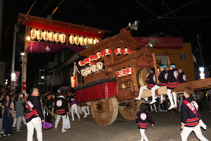 | ● 獅子講 (ししこう・泉南市樽井地区) ・新調:昭和26年 ・大工:波有手の大工 ・彫師:不明 ・本幕:紀繍乃や ・太鼓:不明 ・宮入:茅渟神社 ◎ 樽井のやぐらについて 樽井は樽井地区でやぐらをもっていず「講」組織で成り立った四講があります。また樽井の櫓には雄,雌があると言われており、獅子講が雄、宮元講が雌の上の櫓。戎福中講が雄、濱中講が雌で下の櫓とそれぞれ一対になると言われている。 ◎ やぐらの歴史 先代やぐらは、元治元年/1864年8月に彫師:西岡弥三郎藤原政光師によって新調されたと考えられる。この先代のやぐらは、昭和25年9月3日上陸のジェーン台風によってやぐら小屋ごと倒壊し焼却。 ◎ 現在のやぐら 昭和26年、大工:阪南市波有手在住の大工、彫師:不明によって新調。ただし、西岡弥三郎藤原政光師によって彫られた彫物4点(大屋根正面懸魚,正面欄間,小脇板2枚)は先代やぐらの彫物を使用。平成14年に大工:味園建設によってほぼ新調に近い大修復を実施、同年9月29日に入魂式を実施しました。この際、獅噛みのみ白井秀紀師が彫り、彫物の修復を含め他柱巻,縁葛等新調された彫物は木下彫刻工芸が細工する。やぐらの寸法は長さ10.00m、幅3.50m、高さ4.60m。提灯は正面、屋根周りともに「獅子講」。 ◎ 彫物図柄解説 【大屋根廻り】 ・鬼板 − 獅噛み ・箱棟 − 雲海 ・懸魚 − 正面:松に鷹、 後面:梅福仙人 ・飛檐垂木 − 菊紋 ・地垂木 − 菊紋 ・車板 − 正面:雲龍に竹に虎、 後面:雲龍に竹に虎 ・枡組 − 三手先四段:龍,唐獅子 ・枡合 − 波濤、 後面右のみ:雲海 ・木鼻 − 上段:獅子、 下段:象 ・虹梁 − 上段:若葉 ・欄間 − 正面:唐獅子に手鞠、 右:波間に阿龍、 左:波間に阿龍 ・虹梁 − 下段正面:牡丹、 右:波濤、 左:波濤、 後面:若葉 ・柱巻 − 右:獅子の子落とし、 左:獅子の子落とし ・御簾 − 日輪に阿龍と宝珠を掴む吽龍 ・小脇板 − 右:獅子の子落とし、 左:獅子の子落とし ・幕板 − 右:ケイ康,阮咸,山濤,向秀、 左:劉伶,王戎阮籍 【竹林の七賢】、 後面:竹に虎 ・脇障子 − 右:張飛翼徳、 左:関羽雲長 【三國志】 ・竹の節 − 青海波 ・兜桁 − 「獅子」の文字 ・犬勾欄 − 阿吽の唐獅子 ・擬宝珠勾欄 − 勾欄合:牡丹に唐獅子、 束:「獅」の文字 ・縁葛 − 阿吽の唐獅子 【小屋根廻り】 ・鬼板 − 獅噛み ・箱棟 − 雲海 ・懸魚 − 鳳凰 ・飛檐垂木 − 菊紋 ・地垂木 − 菊紋 ・車板 − 波濤 ・枡組 − 三段:唐獅子 ・枡合 − 波間に唐獅子,波濤 ・木鼻 − 獅子 ・虹梁 − 獅噛みに若葉 ・欄間 − 右:松に鶴、 左:竹に雀 ・長押 − 梅に山鵠 ・太鼓廻り − 阿吽の唐獅子 ・幕板 − 右:天の岩戸、 左:天孫降臨 【神話伝説】 ・擬宝珠勾欄 − 勾欄合:牡丹に唐獅子、 束:「獅」の文字 ・縁葛 − 牡丹に唐獅子 【本幕】 ・本幕 − 三面:無地紅 ◎ 曳行パターン ・宵宮:ところ曳き、茅渟神社へ宮入、三井住友銀行前まっせー ・本宮:ところ曳き、茅渟神社へ宮入、三井住友銀行前まっせー ◎ 獅子講の略年表 ・元治元年−先代やぐらを新調。 ・昭和25年9月3日−ジェーン台風によってやぐら倒壊。 ・昭和26年−やぐらを新調。 ・平成14年9月29日−やぐらを大修復、入魂式を実施。 ・平成19年8月26日−味園建設にて駒を新調、やぐら小屋へ搬入。 ・平成19年9月29日−駒を新調、試験曳きを実施。 ・平成21年5月3日−ブレーキパッドを交換、ブレーキテストを実施。 ・令和2年−新型コロナウイルス感染症対策として曳行自粛。 ・令和3年−新型コロナウイルス感染症対策として曳行自粛。 ・令和6年10月−紀繍乃やによって本幕を新調。 |