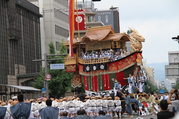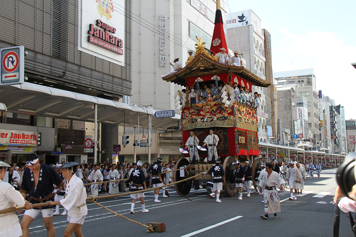 | 祇園祭は全国の祭りの発祥の祭りとも言われておりその歴史は平安時代貞観11年/869年、都に疫病が流行した時、その退散を願って御霊会を始めたのが起源と言われており、天禄元年/970年からは毎年行われる様になりました。以来、祇園御霊会すなわち祇園祭はさまさまな変遷を重ね南北朝時代の14世紀には現在の山鉾の原型ができたと言われています。 室町時代には山鉾の数も増え、また趣向を凝らした立派な山鉾になりましたが京都を焼き野原にした応仁の乱で祇園祭は一時中断。しかし応仁の乱後20年余り過ぎた明応9年/1500年に山鉾を復活させ安土桃山時代から江戸時代初期にかけて海外貿易によって町衆も繁栄していった結果、山鉾はさまざまな装飾品を飾った立派な山鉾になって現在に至ってます。 現在では毎年7月1日から一連の祇園祭が始まり前祭として7月17日には23台の山鉾、7月24日には後祭として11台の山鉾が巡行します。また八坂神社の三基の御神輿によって7月17日に神幸祭、7月24日に還幸祭が行われます。 この山鉾巡行の一番の見せ場が「辻廻し」と言われる、交差点を90度廻す様子。祇園祭でも「廻す」と言うのが1つのポイントとなります。 |