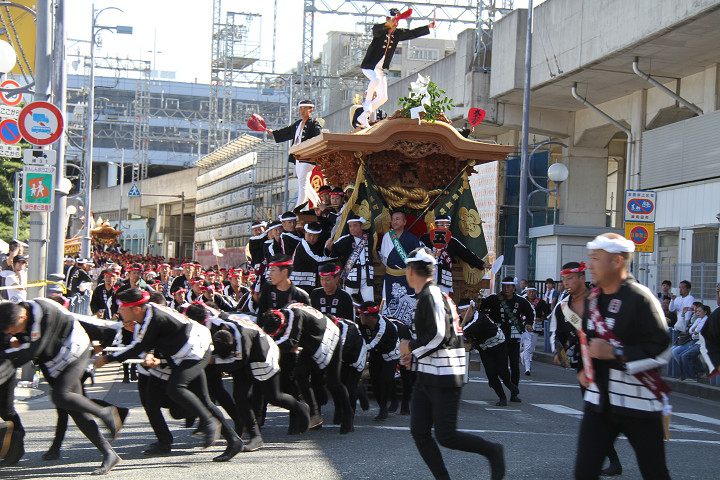| そもそも全国の祭りの発祥は祇園祭ですが、岸和田祭の山車である"だんじり"は、京都→大阪→堺→泉大津→岸和田と伝わったと言われてます。 この岸和田だんじり祭の起源は定かではありませんが一般に言われているのは元禄16年/1703年、岸和田藩主岡部長泰公が京都伏見稲荷を岸和田城内三の丸に勧請し、五穀豊穣を祈念した稲荷祭がその起源であり、年に一度城下町の人々を城に招待したと言われています。古くは獅子舞や相撲、俄芸等が行われましたが、天神祭を含む大阪の祭りの影響を受け、次第に長持に太鼓をのせ、綱をつないで引っ張った山車を曳く様になりました。この山車は祇園祭を発祥とした山車であり、現在のだんじりにつながってると言われています。 現在では、泉佐野市・田尻町以北の各地にだんじりがあり、特に全国的に有名な岸和田市・旧市地区には22台ものだんじりが曳行され、毎年敬老の日の前の土曜日・日曜日に祭禮が行われてます。 ちなみにだんじりの見せ場は「やり廻し」、交差点を勢いよく90度廻す様子。ココでも「廻す」と言うのが1つのポイントとなります。 |