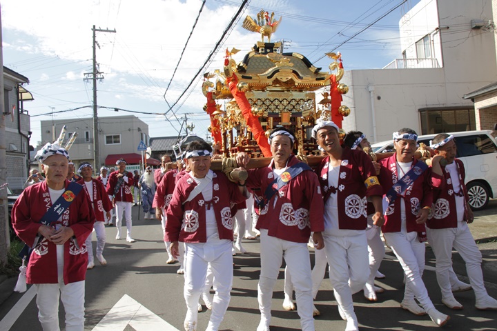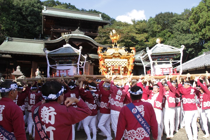 | 本宮にはやぐらが波太神社へ宮入しますが後宮には神輿渡御が行われます。神輿渡御には波太神社へ宮入する18町の中、貝掛を除く17町と桑畑が加わった18町で8年に1度、神輿渡御を行います。神輿渡御は御神体が乗る本神輿(鳳神輿)と暴れ神輿(鳥神輿・玉神輿)の三基が波太神社から海老野まで渡御します。 当日、早朝からナルを組み波太神社にて神幸祭を実施、海老野にて御旅所祭を実施、最後に波太神社にて還御祭を実施します。町によりますが海老野では神輿が海に入る光景を見る事ができ、担ぎ手が実際に海へ入るのは非常に珍しいそうです。 ● 御神輿の班 ・石田宮本・桑畑 ・自然田上組・自然田東組・自然田上東組 ・黒田・下出 ・鳥取中・和泉鳥取・山中渓 ・相生町・朝日町 ・大西町・尾崎宮本町 ・西鳥取上組・榮組・波有手組 ・新町 |
