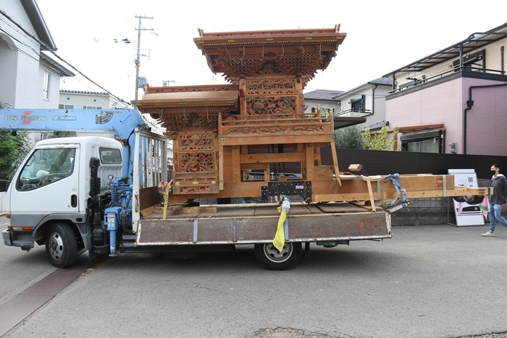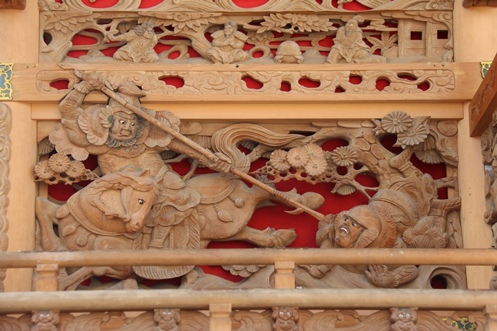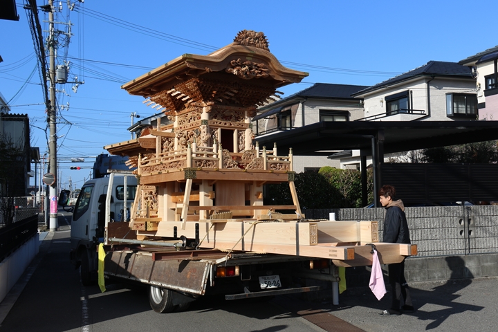 次に大修復前と後を御紹介します。まずは大屋根鬼板正面。![]() ![]() 次に大屋根幕板右面、彫物に色も加えられています。 ![]() ![]() 最後に小屋根幕板左面。 ![]() ![]() 梶台には町紋の閂(カンヌキ)も加えられました。 ![]() |