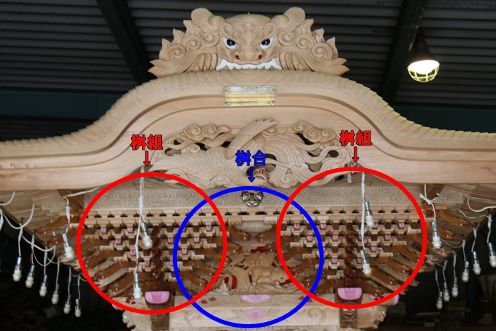 | 親サイト内「やぐら名称紹介」を最後に編集したのが10年以上前になります。そこで改めて「地車研究」と題して各項目を【推敲】しようと思います。今回は「桝組(マスクミ)」を推敲します。 まず【桝組】をネットで検索すると「屋根を支えるために柱頭に設ける部材」とあります。やぐらには下画像の通り大屋根・小屋根ともに4ヶ所合計8ヶ所に桝組があります。一方、一枚板の桝組で桝合がないタイプも存在します。 |