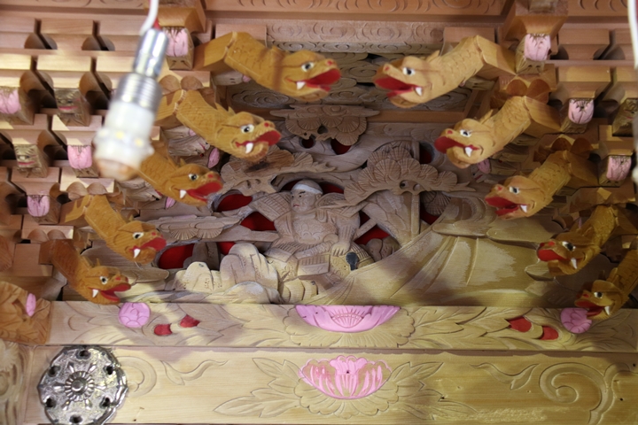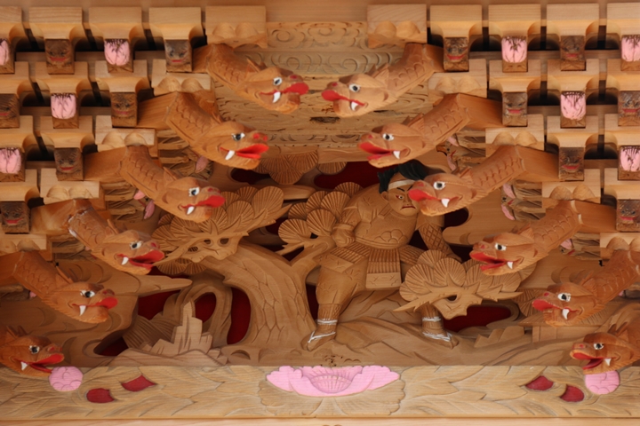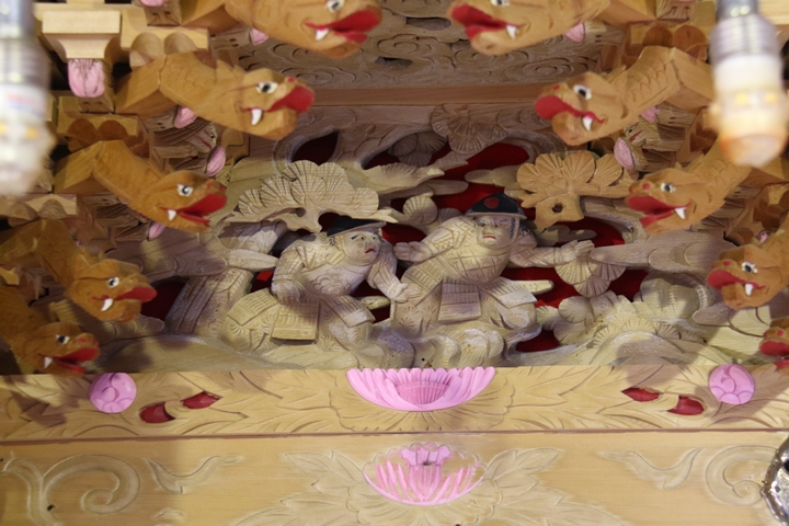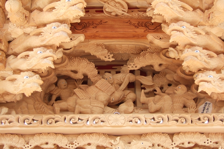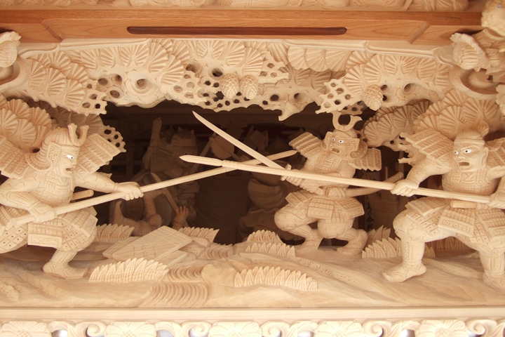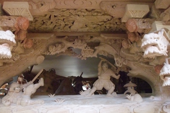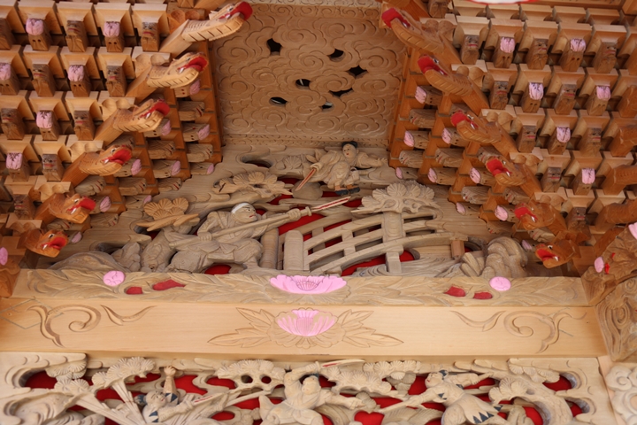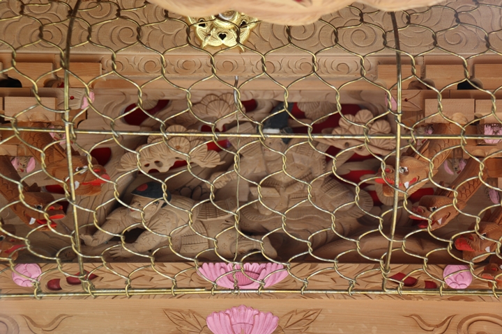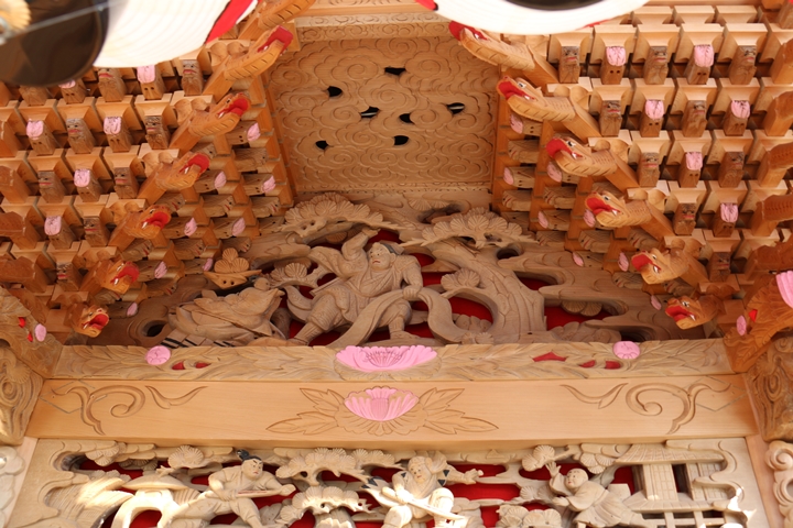 | 桝合の中でも色々な種類があり彫物を一面に施したタイプ、そして二重桝合として彫物の上にもう一つ別の題材の彫物を施したタイプ、そして三方見送りとして小屋根三面から彫物を三方向から見れるタイプがあります。 |