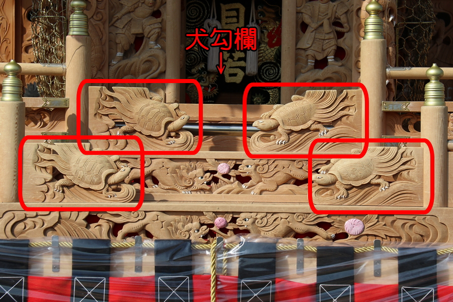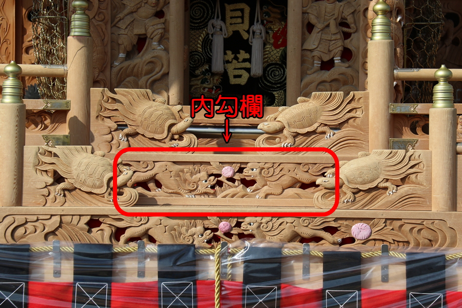 | 親サイト内「やぐら名称紹介」を最後に編集したのが10年以上前になります。そこで改めて「地車研究」と題して各項目を【推敲】しようと思います。今回は「勾欄(コウラン)」を推敲します。 まず【勾欄】をネットで検索すると「橋・回廊・廊下などにつけた手すり、らんかん」とあります。やぐらには板勾欄、内勾欄、犬勾欄と大きく3つに分ける事ができ板勾欄は大屋根正面の左右2ヶ所・右面・左面・後面の左右2ヶ所、小屋根右面・左面、合計8ヶ所あります。 |