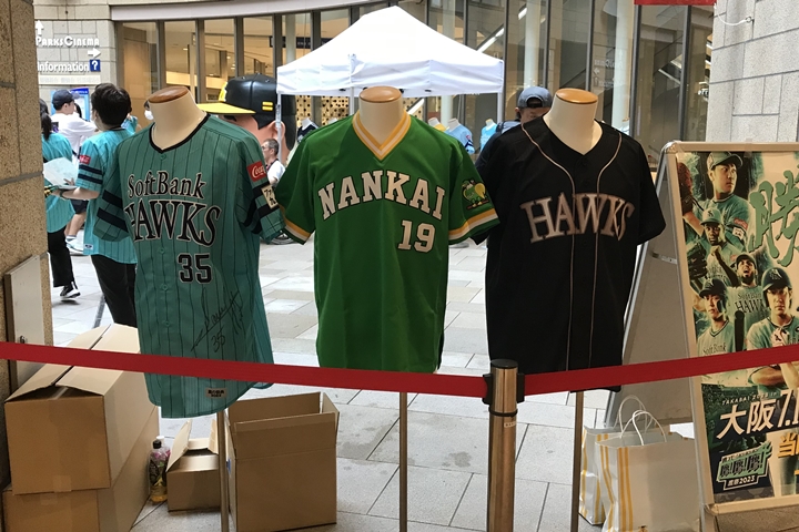 先日なんばパークスへ行くとソフトバンクホークスのイベントが行われていました。どうやら京セラドームでの「鷹祭」に因んだイベントの様で歴代のユニフォームが展示されていました。その中に懐かしの南海ホークスのユニフォームがあり思わず撮影。今年はオリックスバッファローズ、そして阪神タイガースと在阪球団が首位を突っ走っており野球ネタ書いてても楽しみがあります。 |