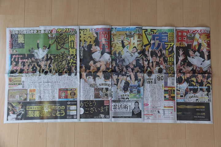 15日木曜日、阪神タイガースが18年ぶりの優勝。正直、18年って歳月は長かったです。そして翌日、記念にスポーツ新聞5紙を購入。当然ながら5紙全ての一面が阪神タイガース優勝。私も晩酌しながらサンテレビを見てましたが優勝が決まった瞬間、思わず拍手喝采。以後、晩酌が祝杯へと変わりました。