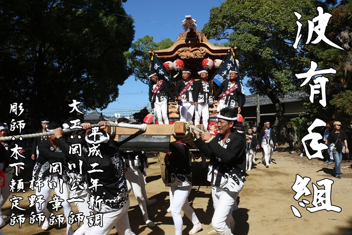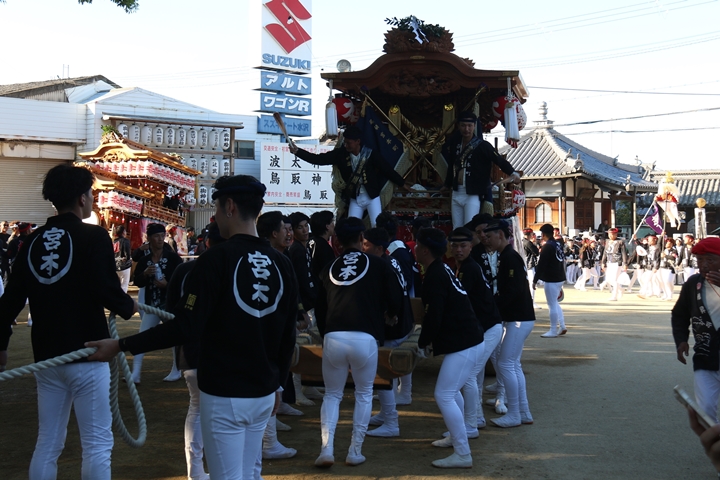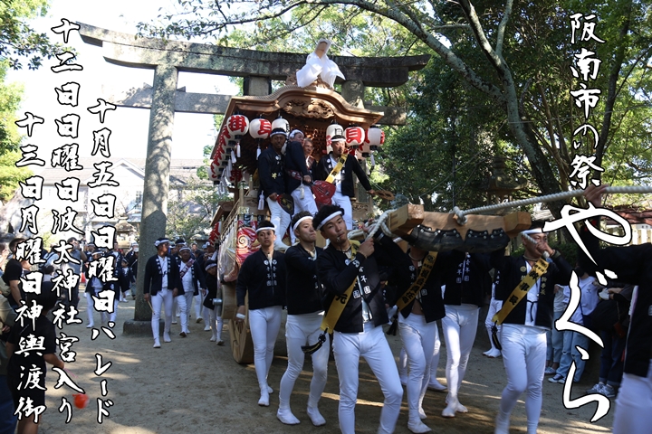 2025/9/21 - 波太神社![]() ![]() ![]() ![]() 祭禮を前にやぐらが宮入りする神社を御紹介します。 【波太神社】 阪南市石田167に鎮座し、宵宮には全18台のやぐらが宮入りし本宮には海老野まで神輿渡御を行う。御祭神:角凝命・応神天皇。 |