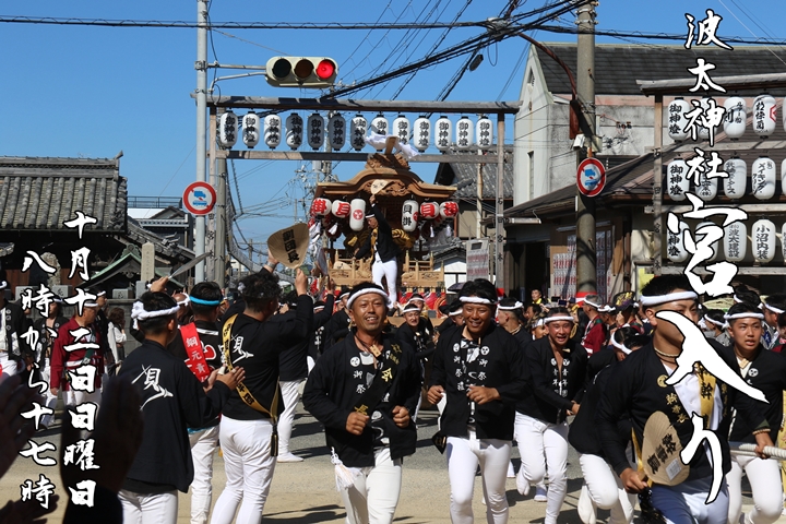 2025/9/27 - 波太神社宮入り![]() ![]() ![]() ![]() 祭禮を前に祭禮の見どころを御紹介します。 【波太神社宮入り】 10月12日日曜日8時から17時まで全18台のやぐらが宮入りします。七段の階段を駆け上がる"宮上がり"は迫力満点。 |