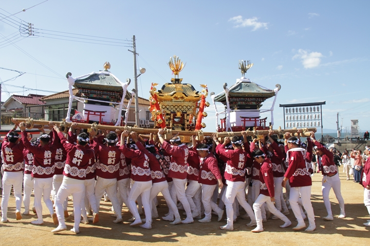 2025/9/29 - 神輿渡御![]() ![]() ![]() ![]() 祭禮を前に祭禮の見どころを御紹介します。 【神輿渡御】 10月13日月曜日、波太神社の本宮の日に本神輿と暴れ神輿二基の合計三基の神輿が海老野の浜まで神輿渡御を行う。今年は新町が担当。 |