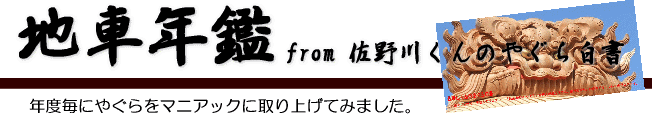 | 今日はクリスマス、平成22年度もあとわずか1週間で終わりを告げます。今年もアッと言う間の1年でした。去る12月10日(金)に漢検(日本漢字能力検定協会)が発表した今年の漢字は「暑」。7月,8月の猛暑、ホンマに暑かったです。でもやぐら界では入魂式等のイベントが例年に比べて非常に少なく「暑」じゃなく「寒」な一年でした。 さて管理人の中の昨年(平成21年)の漢字は「拾」でしたが今年の漢字はズバリ「休」。約9年4ヶ月もの間、沢山の書き込みを頂戴してきました掲示板を無期限休止に追い込まれた非常に残念な一年でした。 (>_<)涙 さて今年も当ブログでも毎年恒例? の「地車年鑑」として平成22年度を振り返ってみようと思います。 |