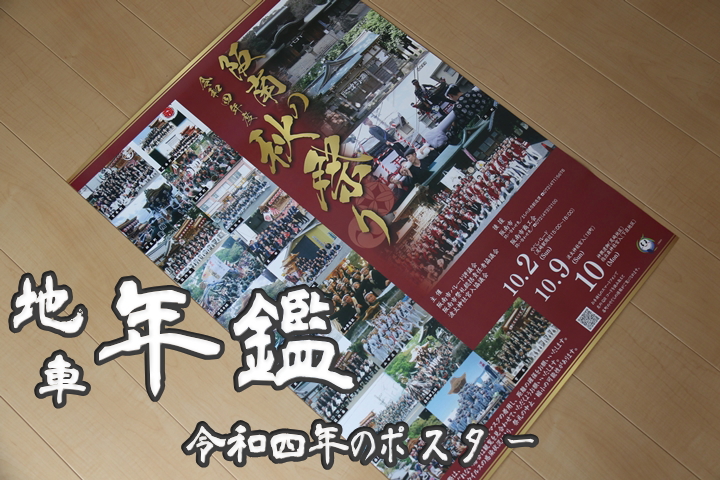 | 今年も管理人は色んな方々からポスターを頂戴しました。いつもながらありがとうございます。この場を借りて改めて御礼申し上げます。さて今回、地車年鑑と題して「令和4年のポスター」を御紹介しようと思います。その前に私のためにわざわざポスターを入手してくださいました新町のMさん、半田さん、そして伊八さん、ありがとうございました。改めて御礼申し上げます。 m(__)m |