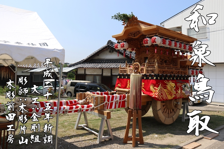 ![]() 【和泉鳥取】 平成25年大工:金剛組、彫師:木彫片山,木彫前田工房によって新調。今年、京美刺繍工芸によって本幕を新調しました。 (東鳥取五地区) |