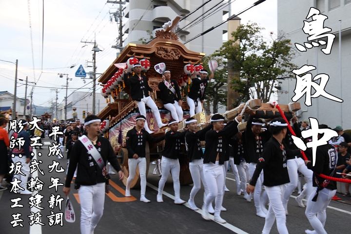 ![]() 【西鳥取上組】 平成6年に大工:古川工務店、彫師:坂本工芸によって新調。今年、平成26年以来10年ぶりにパレードに復帰します。 (西鳥取地区) |