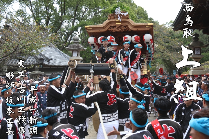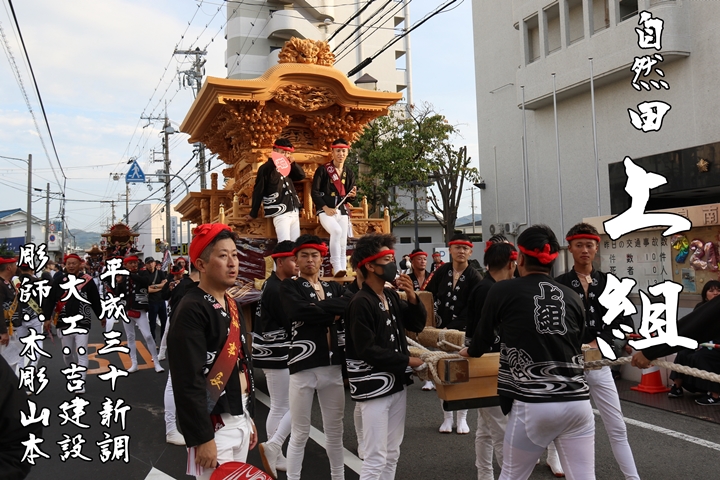 ![]() 【自然田上組】 平成30年大工:吉建設、彫師:木彫山本によって新調。近年、だんじり大工によるやぐらが多い中、地元の大工が手掛けたやぐらです。 (東鳥取五地区) |