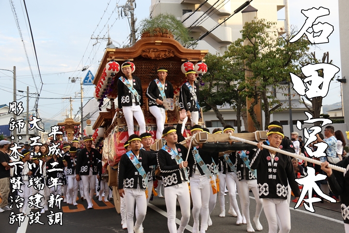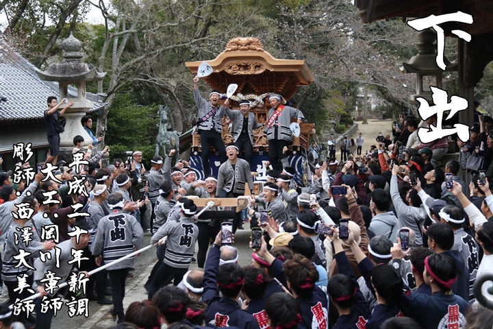 ![]() 【波太神社宮入り】 10月13日日曜日8時から17時まで全18台のやぐらが宮入りします。七段の階段を駆け上がる"宮上がり"は迫力満点。 |